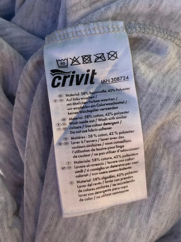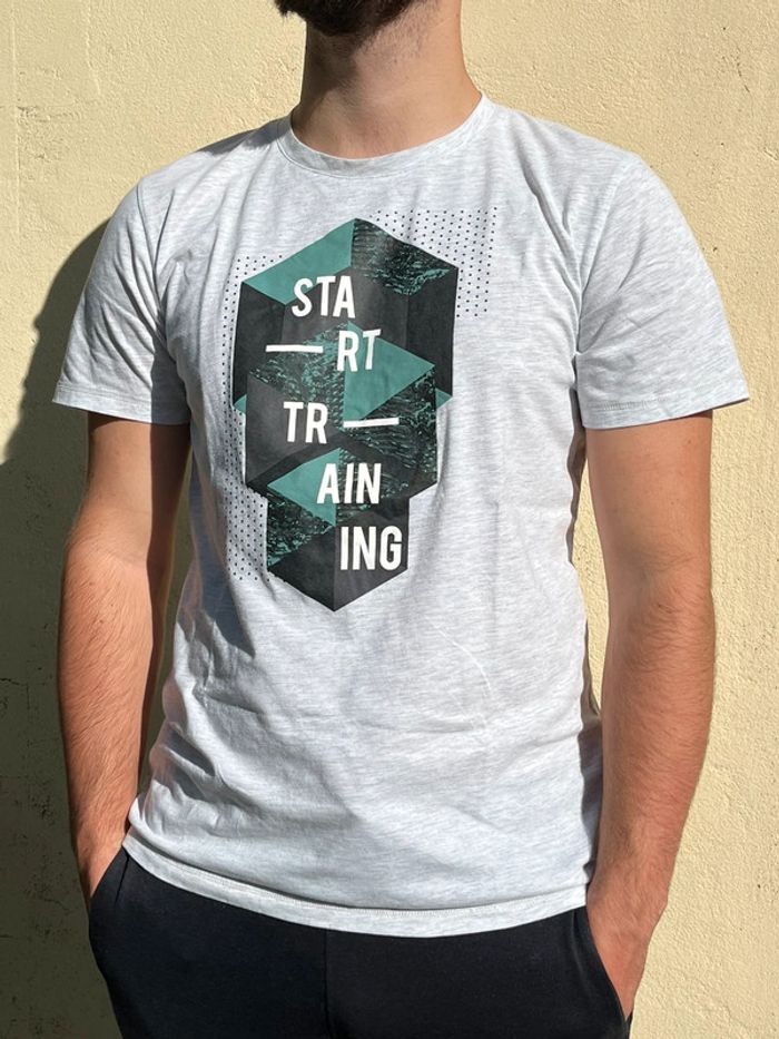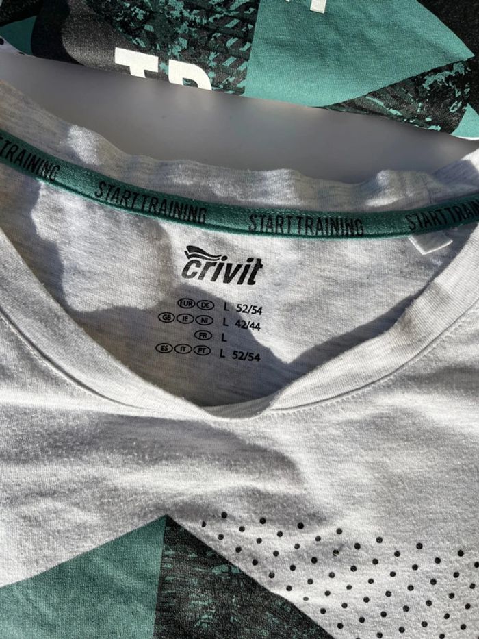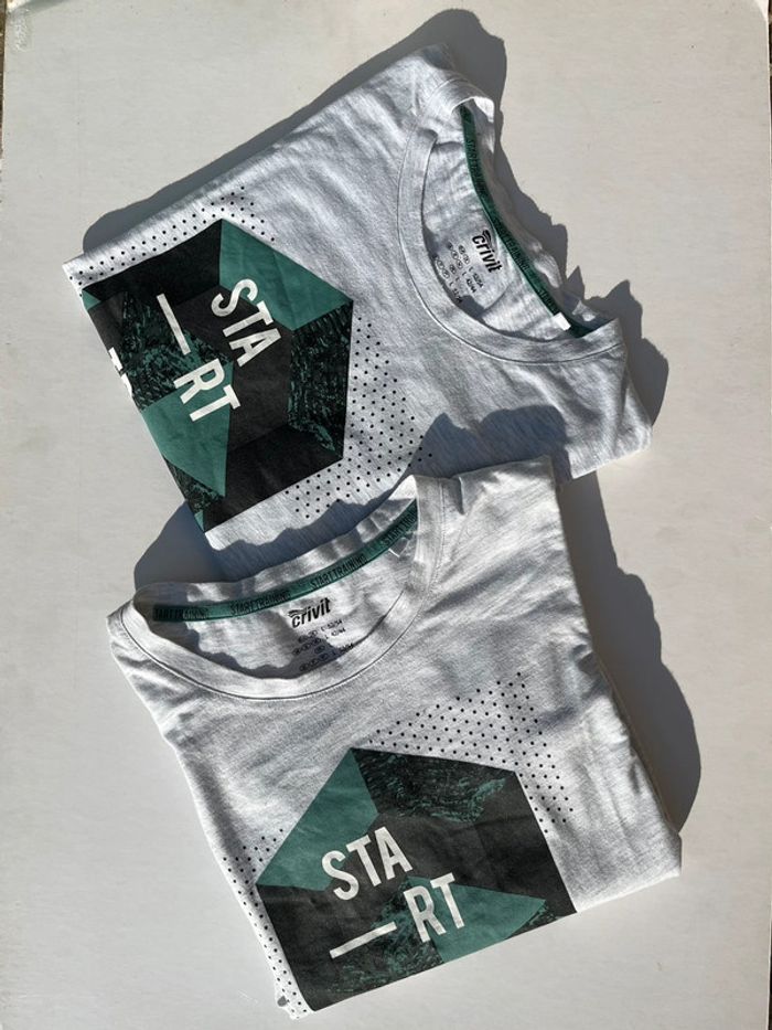 2 t-shirt basique col rond couleur gris nuancé avec imprimé géométrique noir et vert turquoise avec écrit « start training » en blanc. Arrière uni. Taille L (taille porté habituellement L, taille très bien, confortable). Marque : crivit Matières : 58% coton 42% polyester Neufs, jamais porté, uniquement un essayé pour les photos. 🎁 idée cadeau de Noël