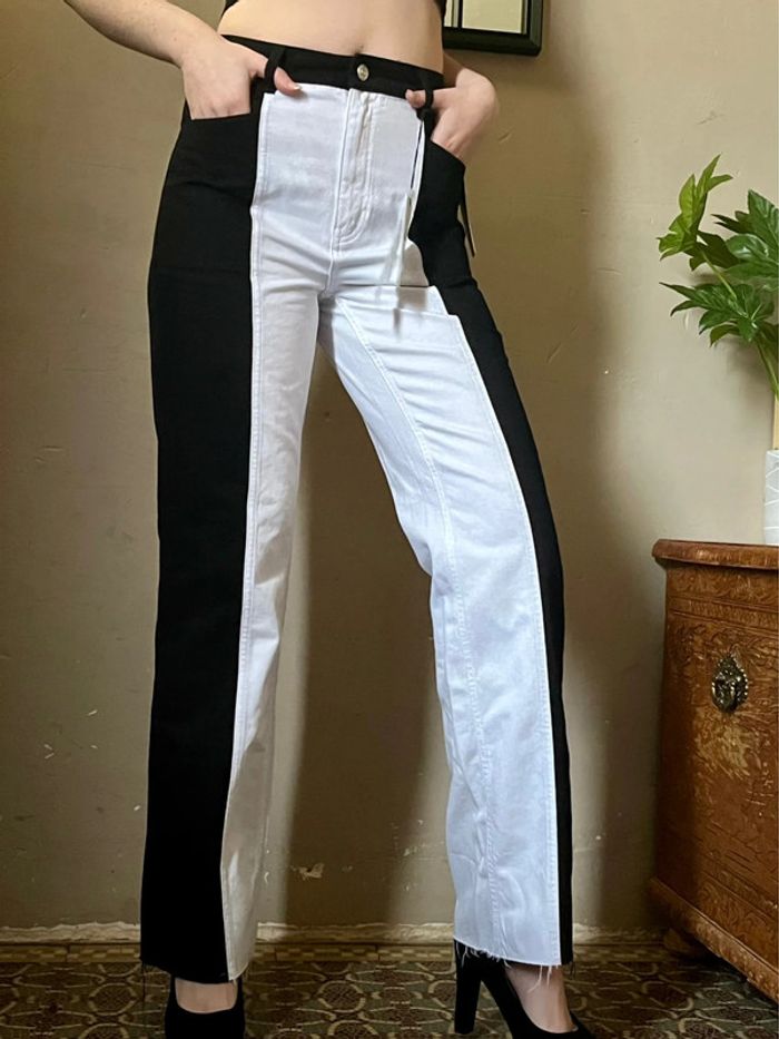 Pantalon jeans bi-color : noir et blanc, taille haute - photo numéro 1