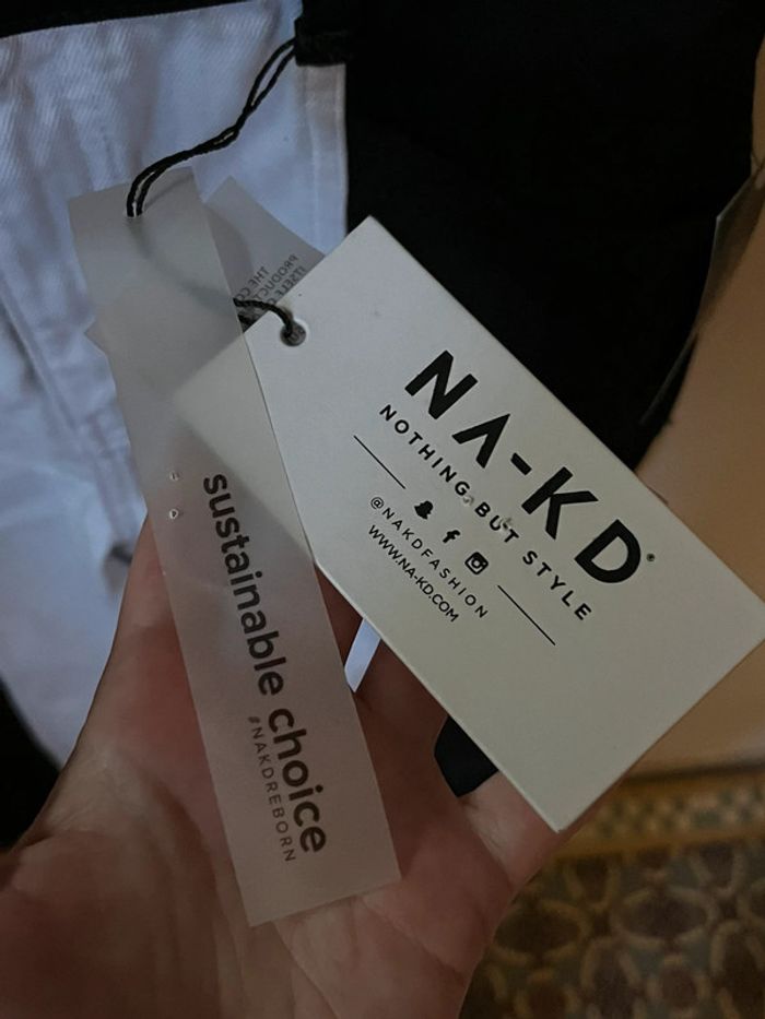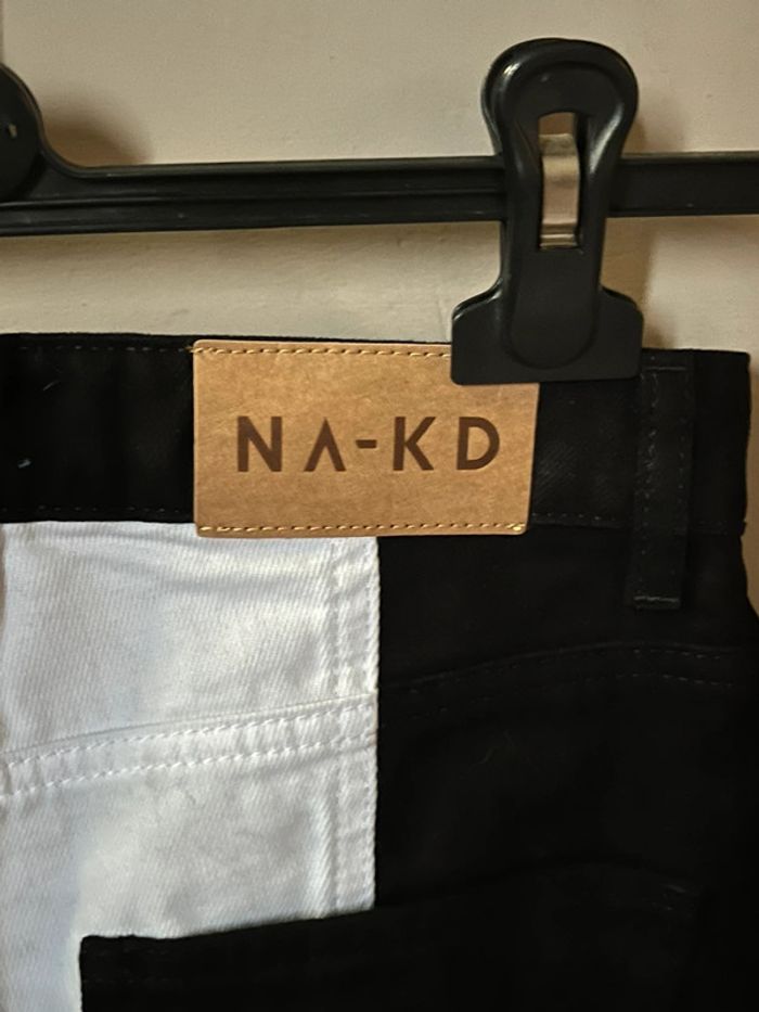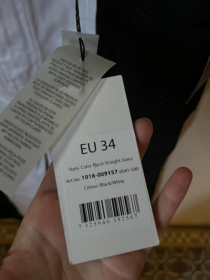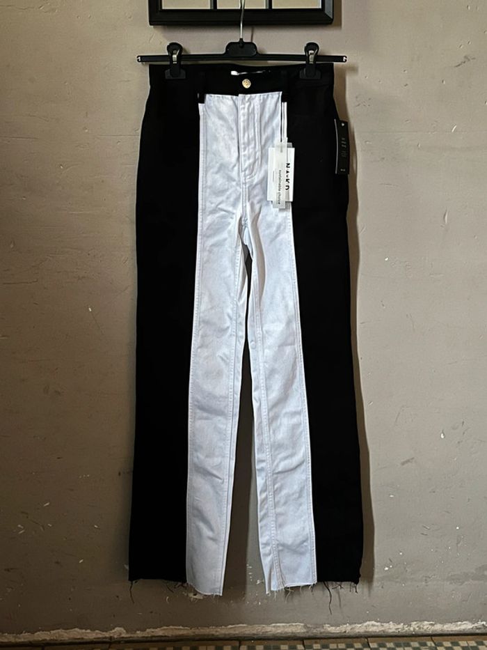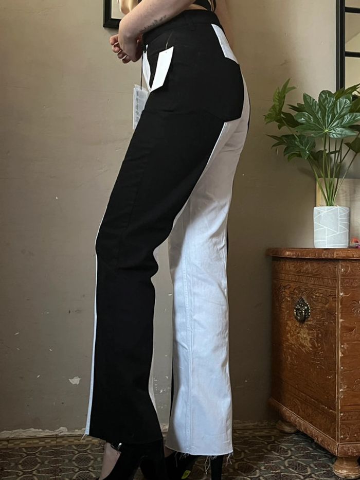 Jeans taille haute, coupe droite et ourlets non cousu type effilochés - 2 couleurs en verticales : côtés extérieurs noir et centre intérieur blanc. 2 poches avant et 2 poches arrière. Taille 34 - XS (je porte du 36-38 et mesure 1,69m, je suis clairement saucissonnée dedans, je rentre dedans mais impossible de m’assoir). Neuf.