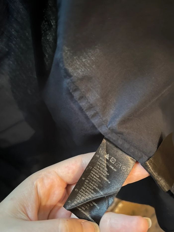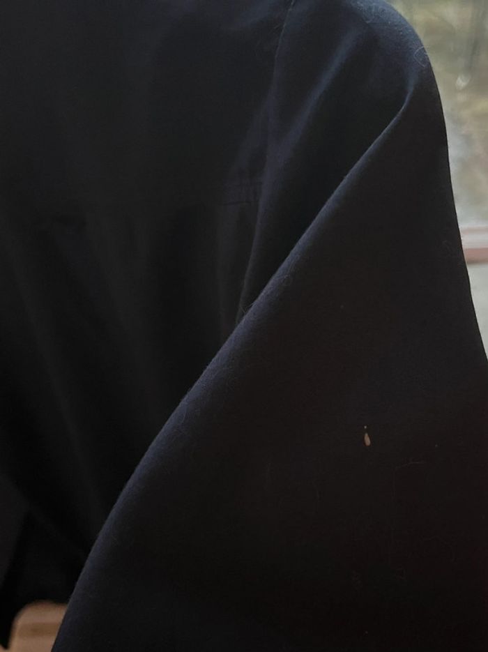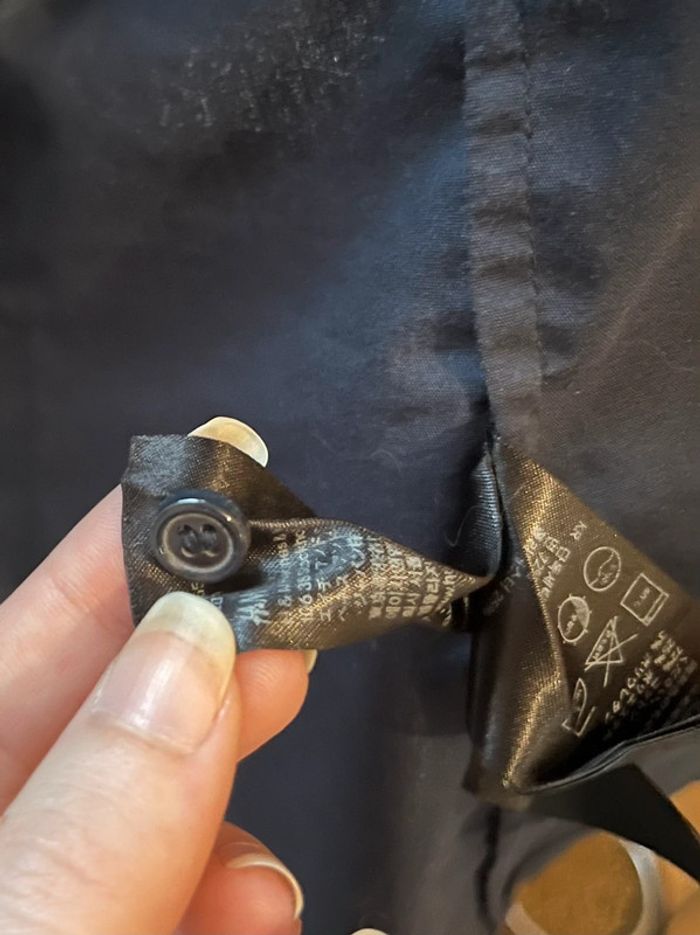 Chemise de couleur bleu marine, fermeture avant avec 6 boutons (1 bouton de rechange cousu sur l’étiquette des matières). 2 poches avant au dessus de la poitrine avec boutons. Manches 3/4 avec 2 boutons sur chaque côté, peuvent être remontées. Chemise cintré (lignes verticales à l’avant et arrière). Taille 42 (appartenait à ma mère (1er modèle) qui porte du XL/XXL mais très juste au niveau de la poitrine, et grande pour moi (à partir de la 3ème photo) je porte du S/M). 72% coton. Porté une 10aine de fois. Très bon état général, mais petite tâche blanche sur la manche droite près de l’épaule (voir dernière photo + visible sur les photos 9 et 10).