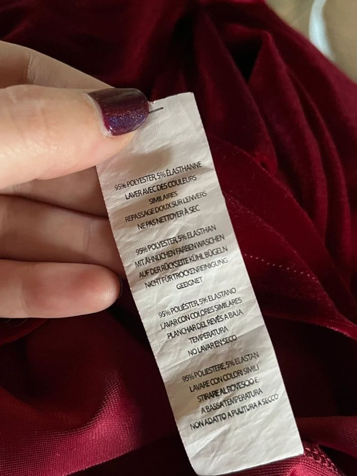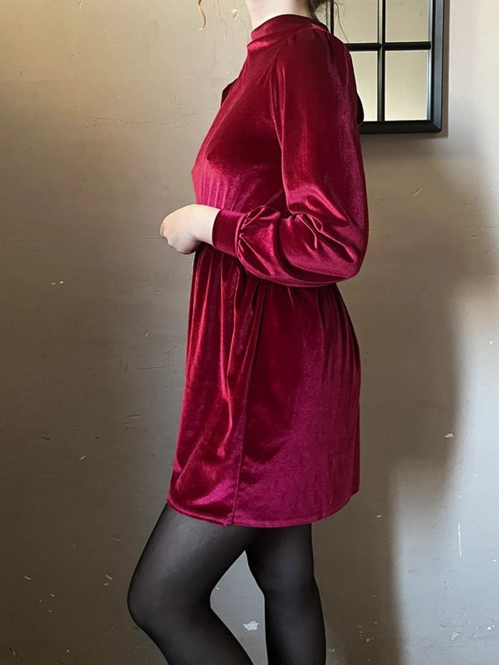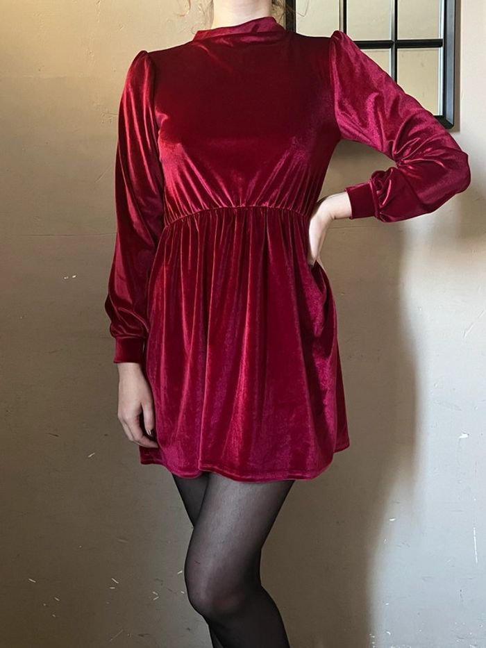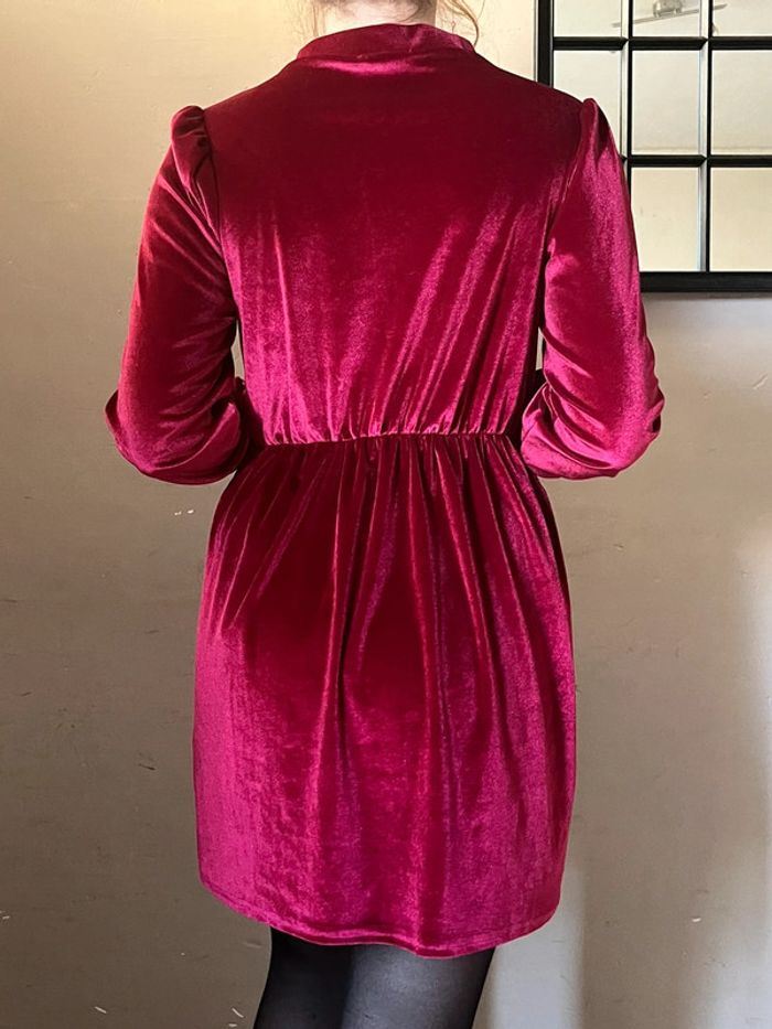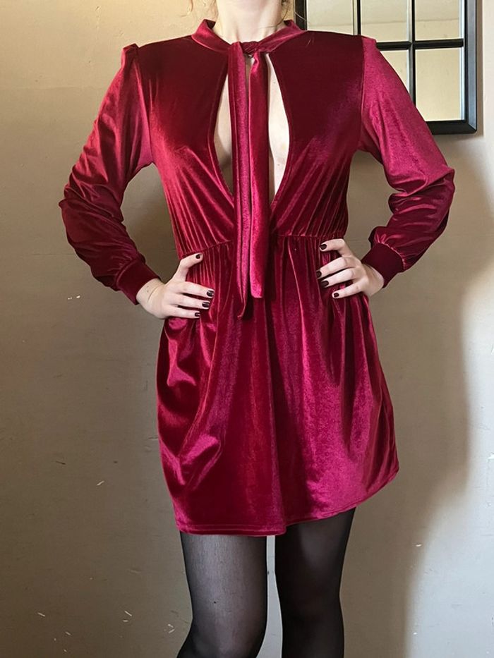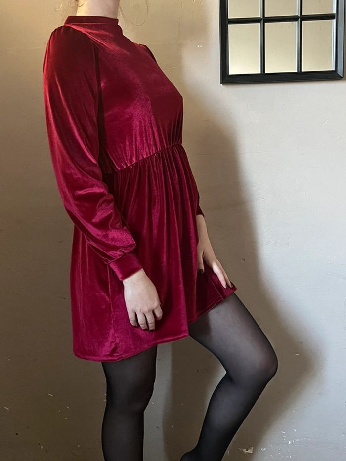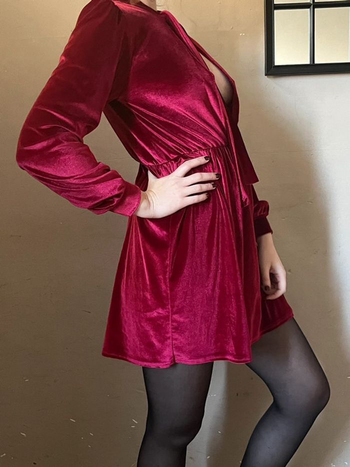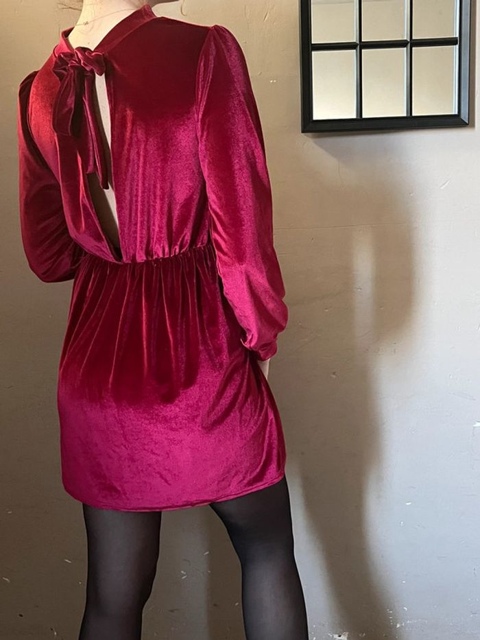 Robe courte (qui arrive au niveau des cuisses) 2 en 1 (peut se porter de deux manières différentes) : peut être décolleté à l’avant ou dos nu à l’arrière avec attache en noeud papillon. Cintré à la taille élastique - manches longues cintré au niveau des poignets. Couleur rouge vers le bordeaux. Matière velour doux, chaud et confortable, parfait pour l’hiver ou Noël. Étiquette au niveau du cou coupée mais pas celle sur le côté. Taille 34 (je porte du S/M, me serre légèrement). Très bon état, pas de signes d’usure.