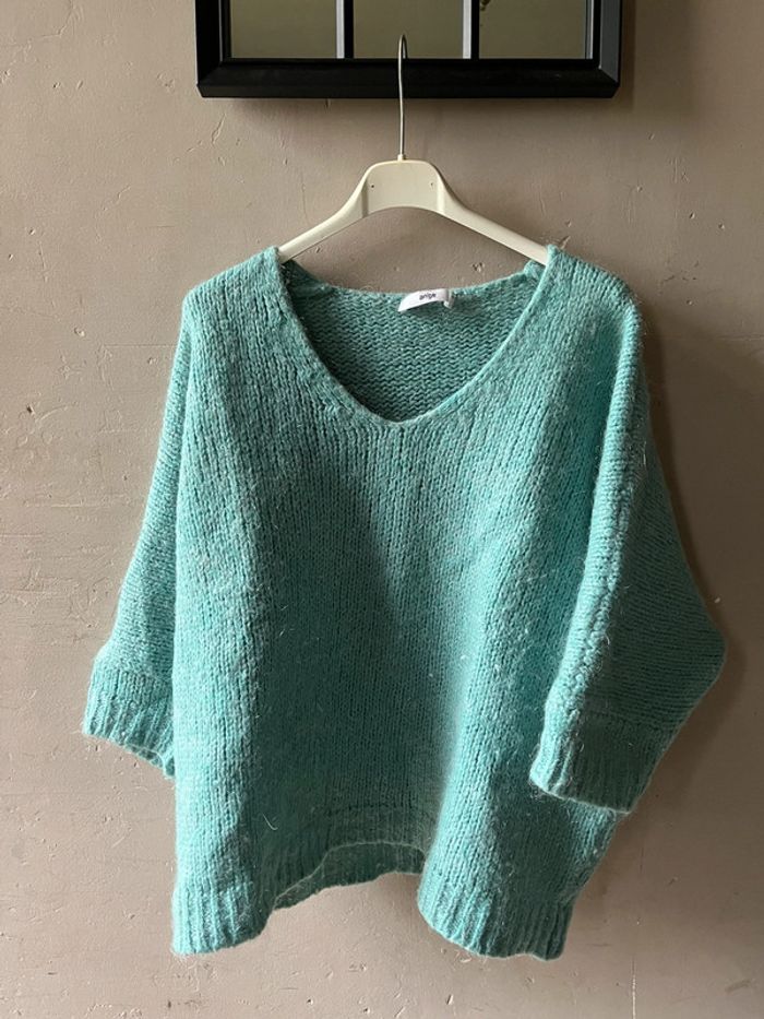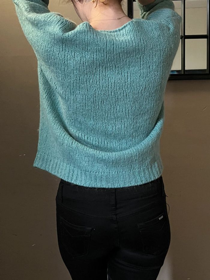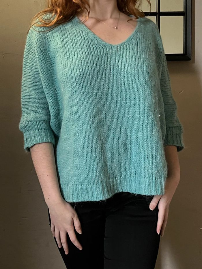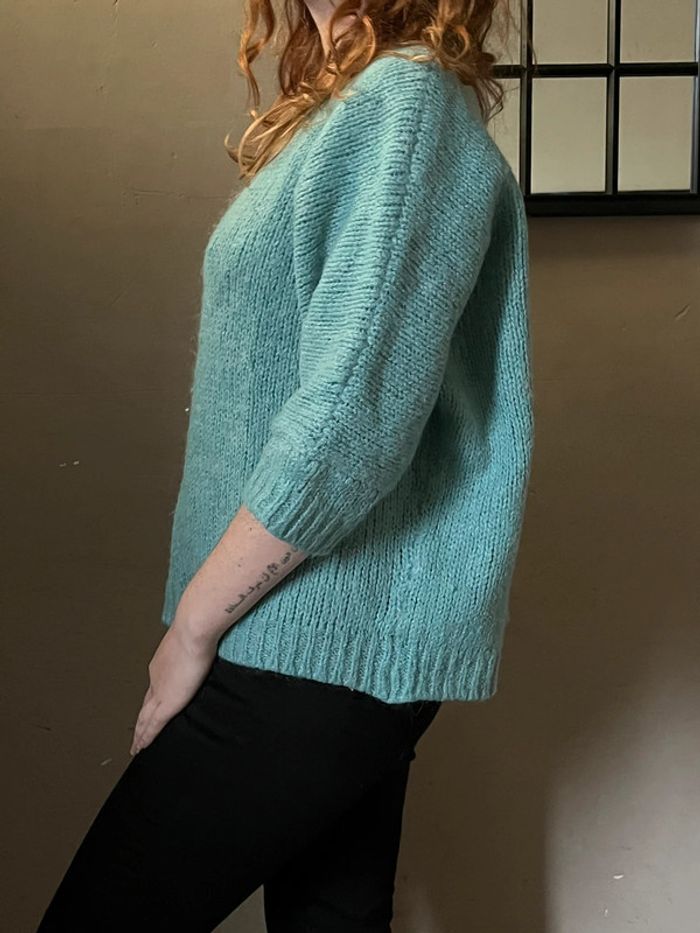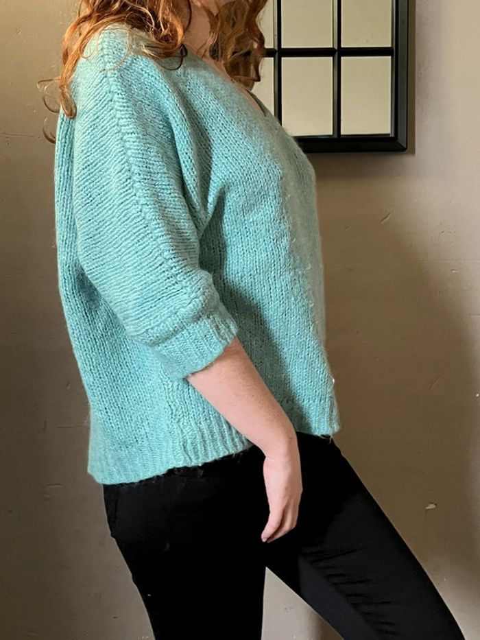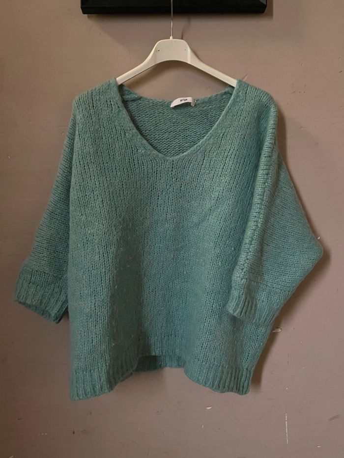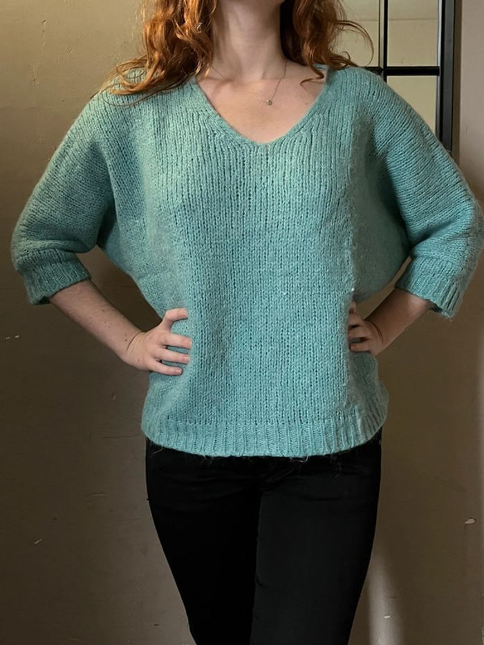 Pull d’hiver avec manches 3/4 (en dessous des coudes) - décolleté col V Couleur bleu turquoise clair - type maille / tricot Taille unique, pourrait convenir à une taille 46 max. (Je porte du S/M, et deuxième mannequin porte du XL/XXL). Très bon état, pas de signe d’usure Porté quelques fois (environ 10X).