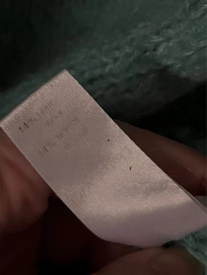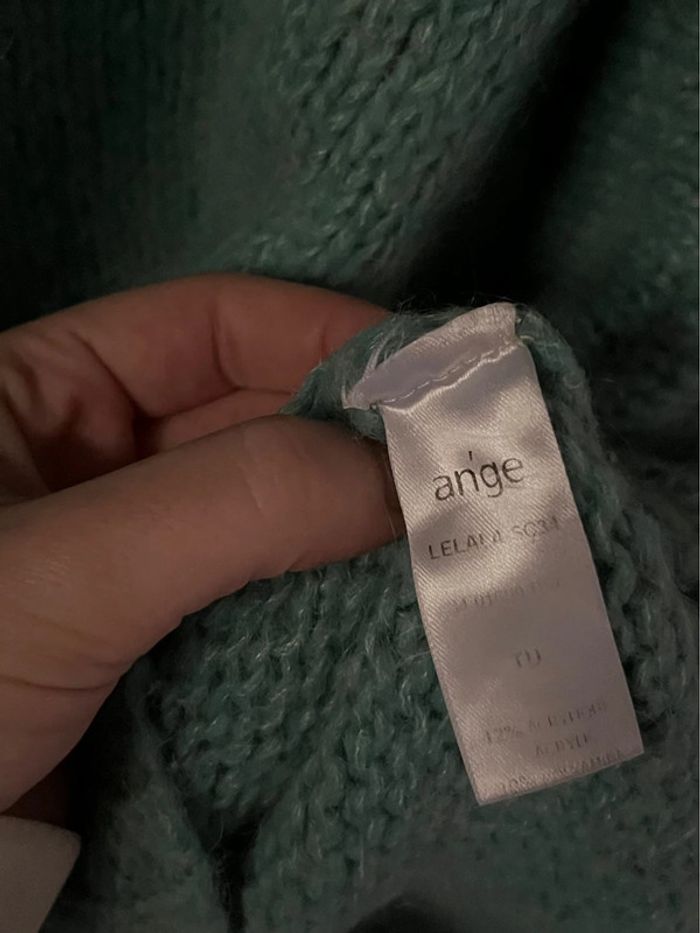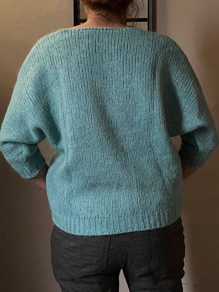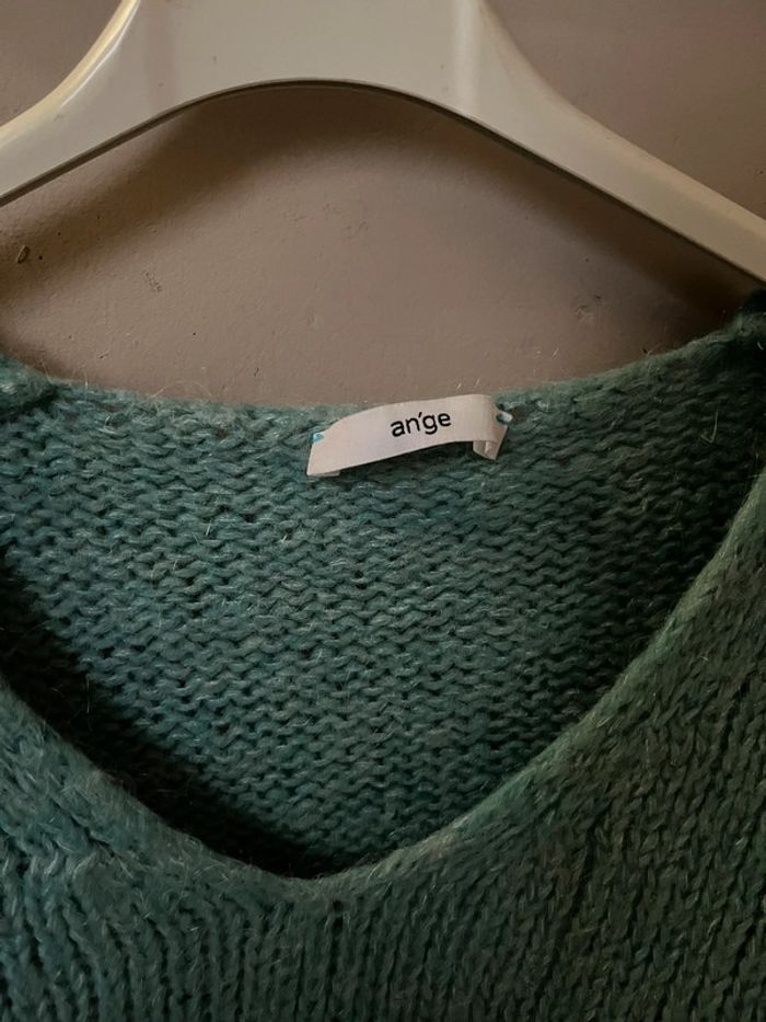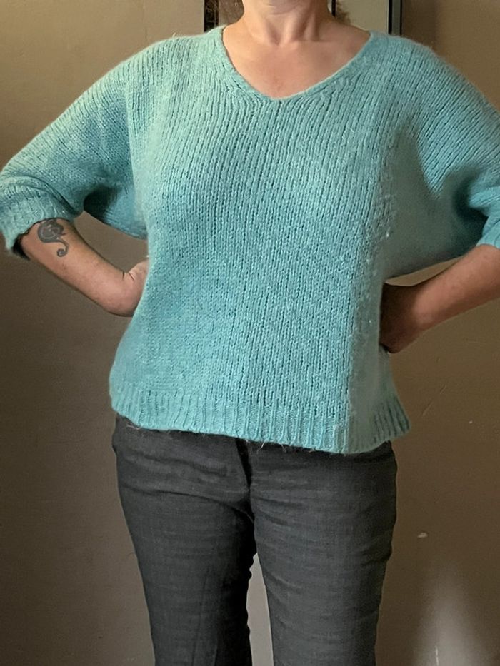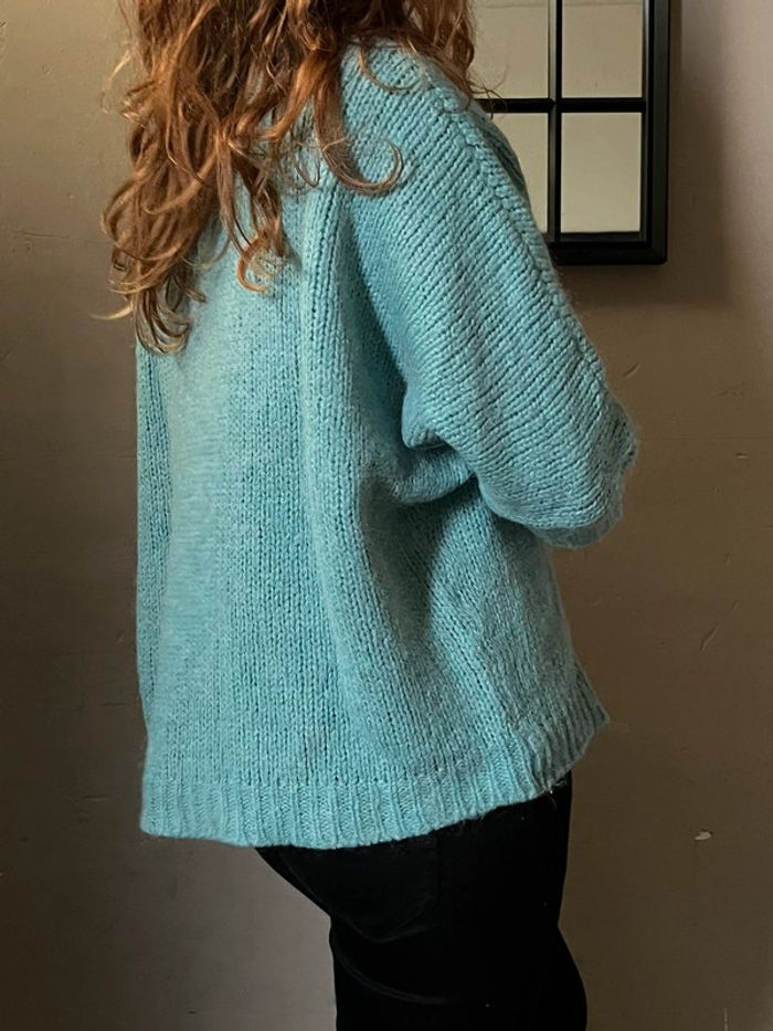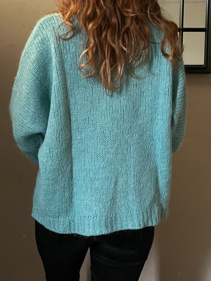 Pull d’hiver avec manches 3/4 (en dessous des coudes) - décolleté col V Couleur bleu turquoise clair - type maille / tricot Taille unique, pourrait convenir à une taille 46 max. (Je porte du S/M, et deuxième mannequin porte du XL/XXL). Très bon état, pas de signe d’usure Porté quelques fois (environ 10X).