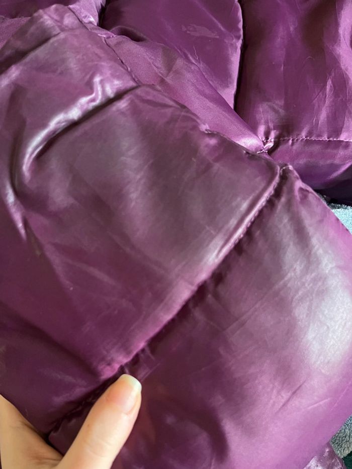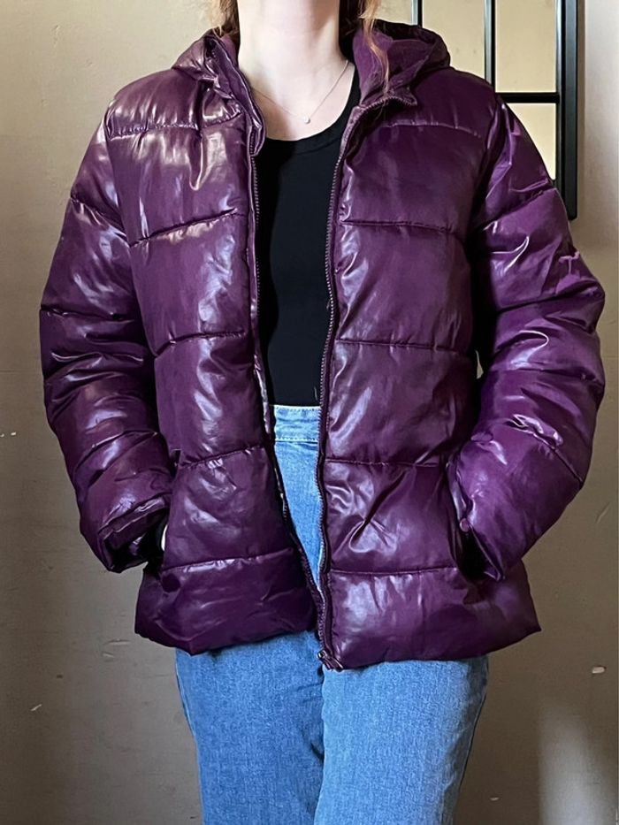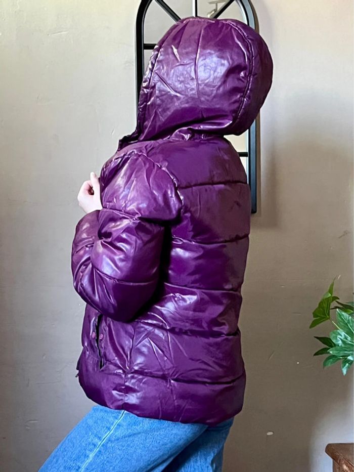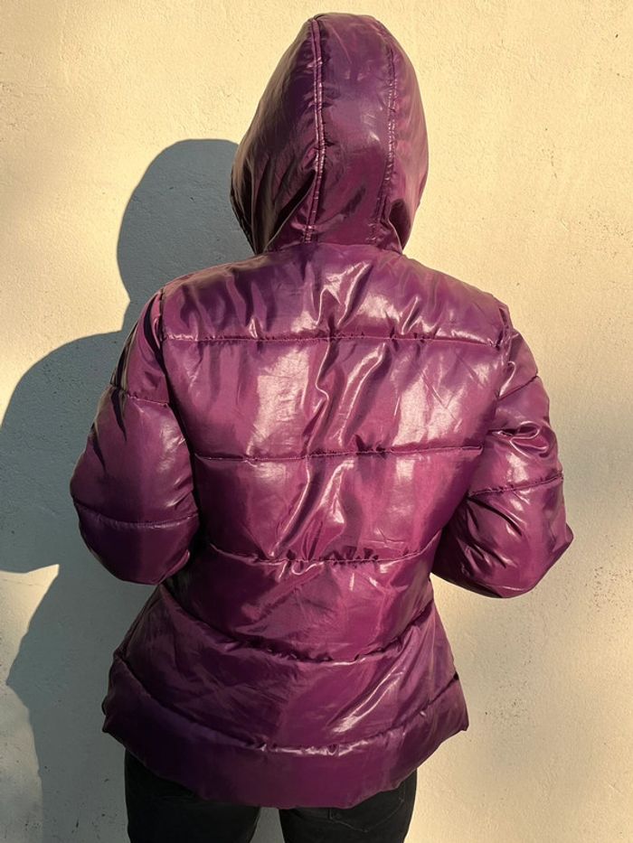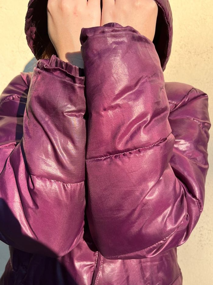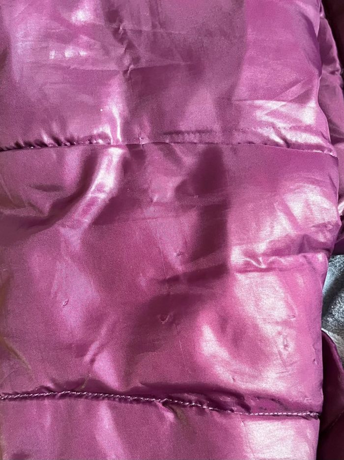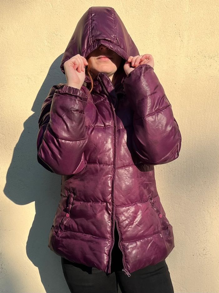 Manteau doudoune matelassée chaude et imperméable avec capuche - couleur violet rose bordeaux / prune satiné (ne donne pas la même couleur au soleil et à l’ombre).