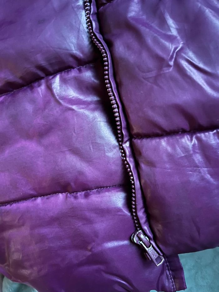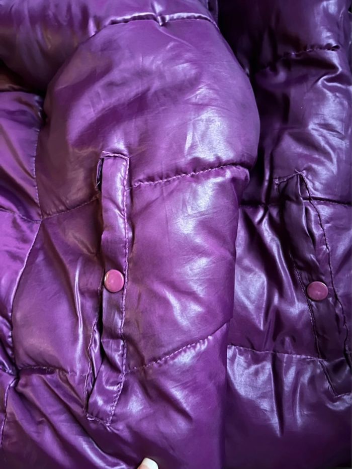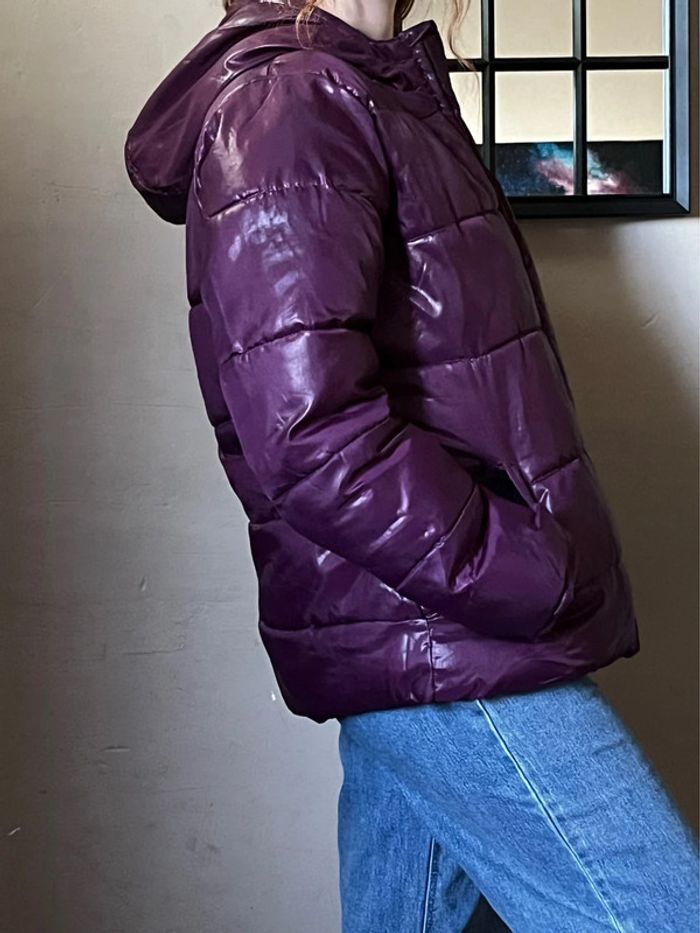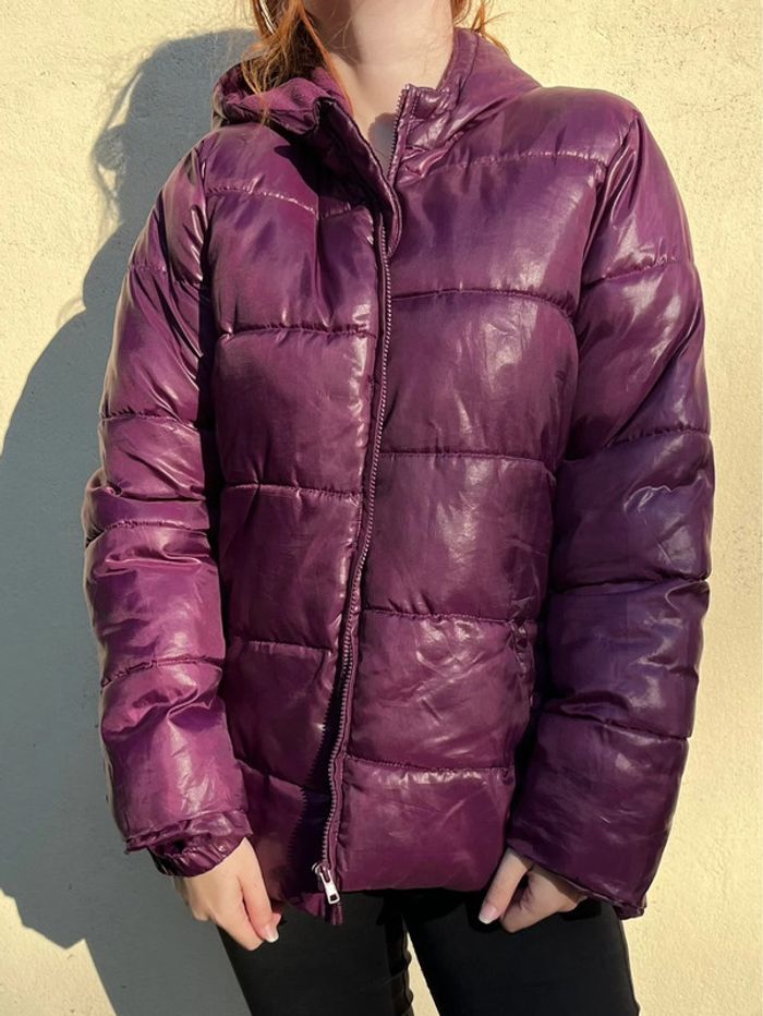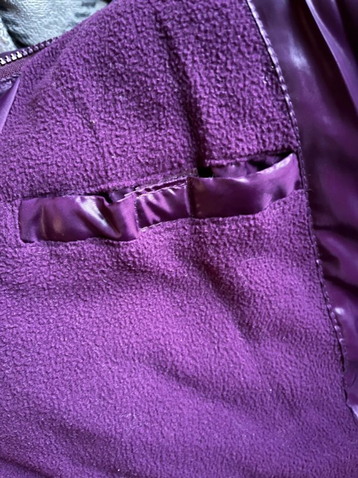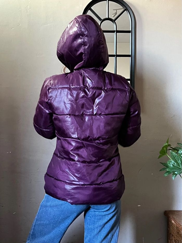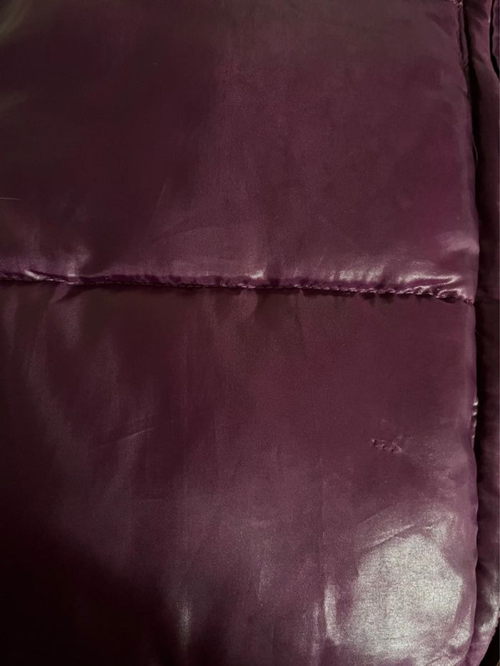Manteau doudoune matelassée chaude et imperméable avec capuche - couleur violet rose bordeaux / prune satiné (ne donne pas la même couleur au soleil et à l’ombre).