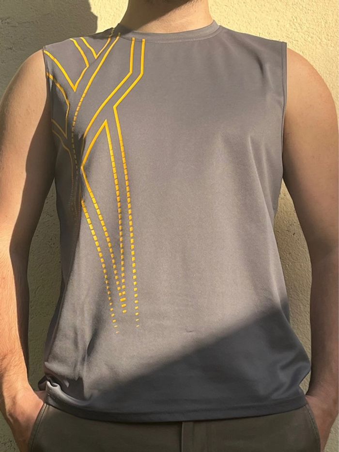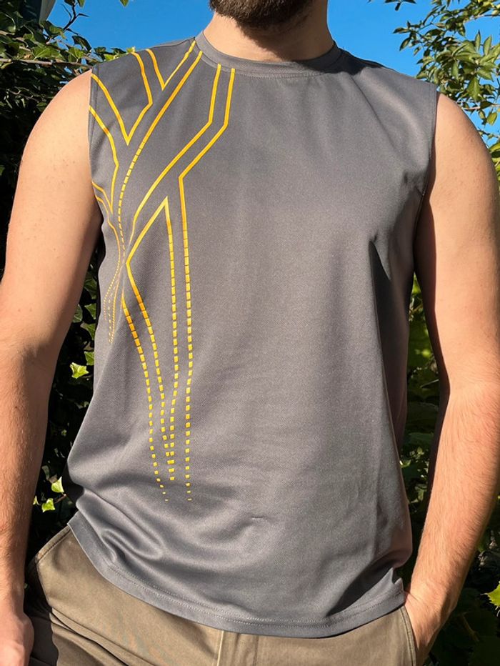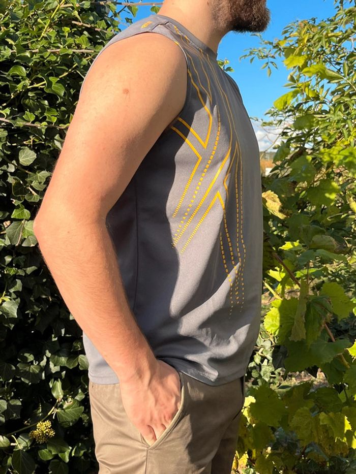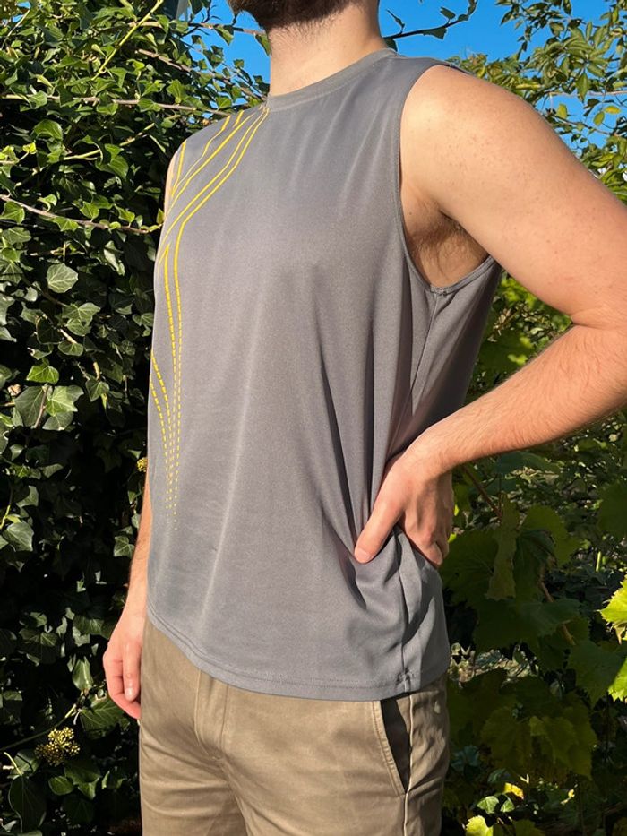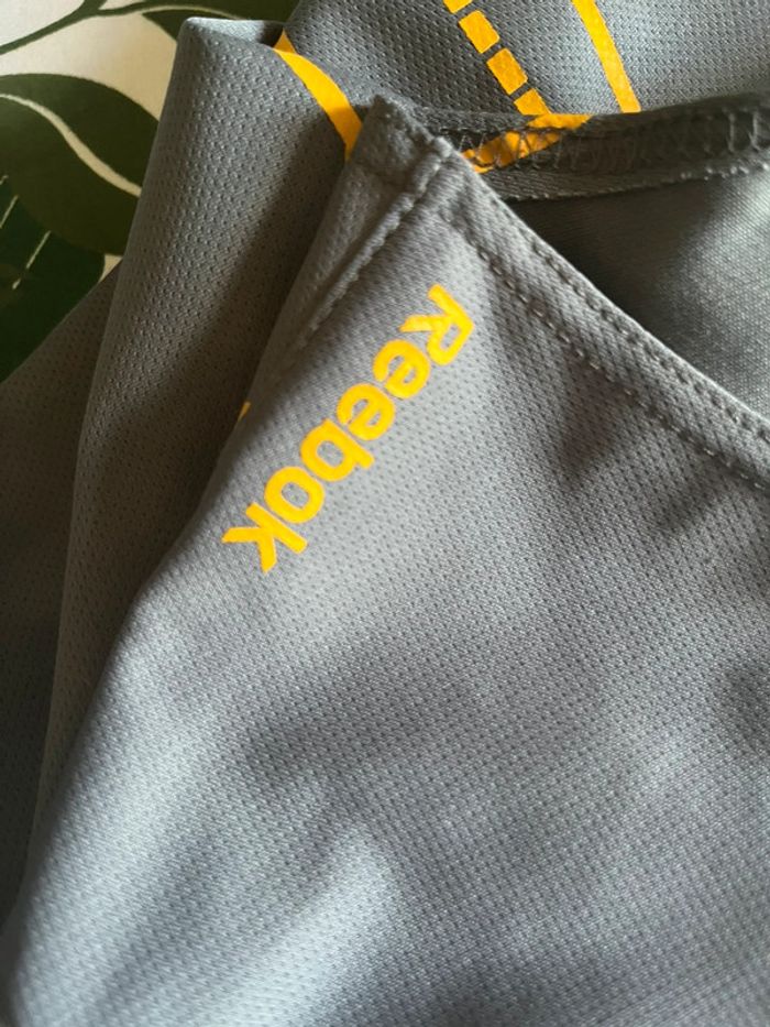 Débardeur de sport gris avec motifs lignes en jaune imprimé côté droit. Marque en jaune sous une aisselle. Taille M (plus lisible) - taille habituellement porté en L, taille bien porté à la bonne taille. Marque : Reebok Matière : 100% polyester Très bon état général. Signe d’usure : quelques accros (1 à l’avant et 2 petites à l’arrière) - voir tout les détails en photos.