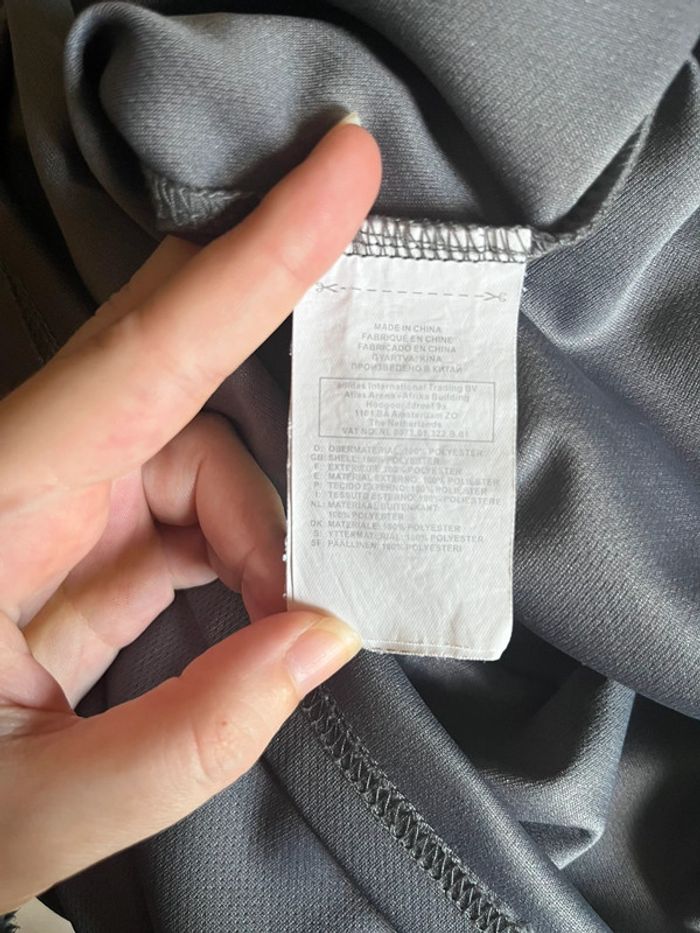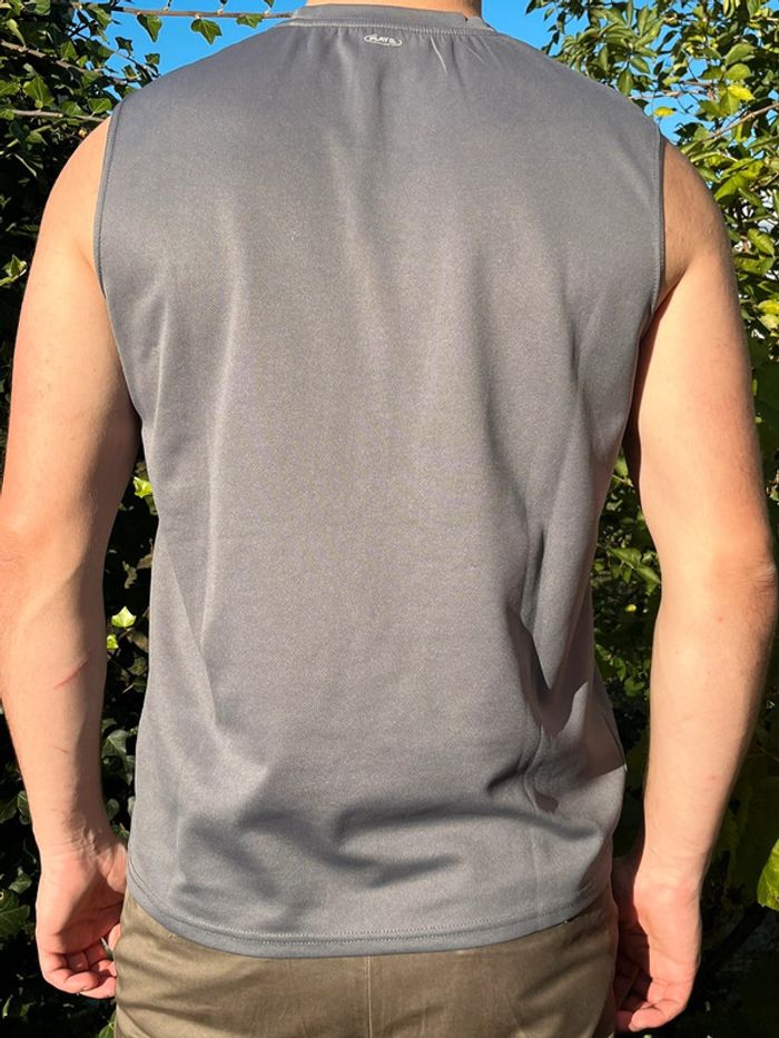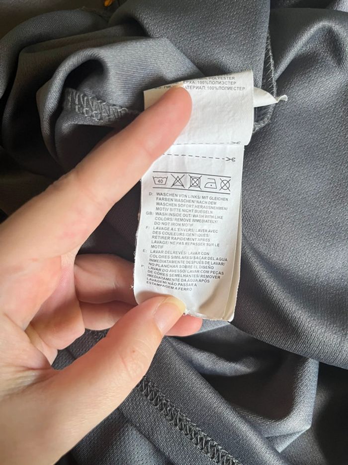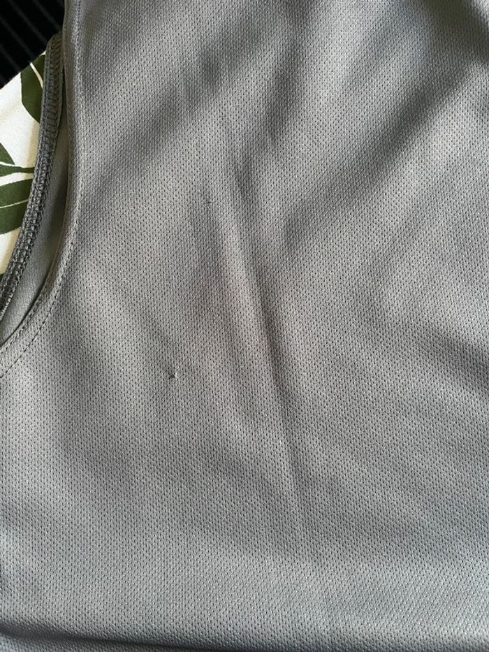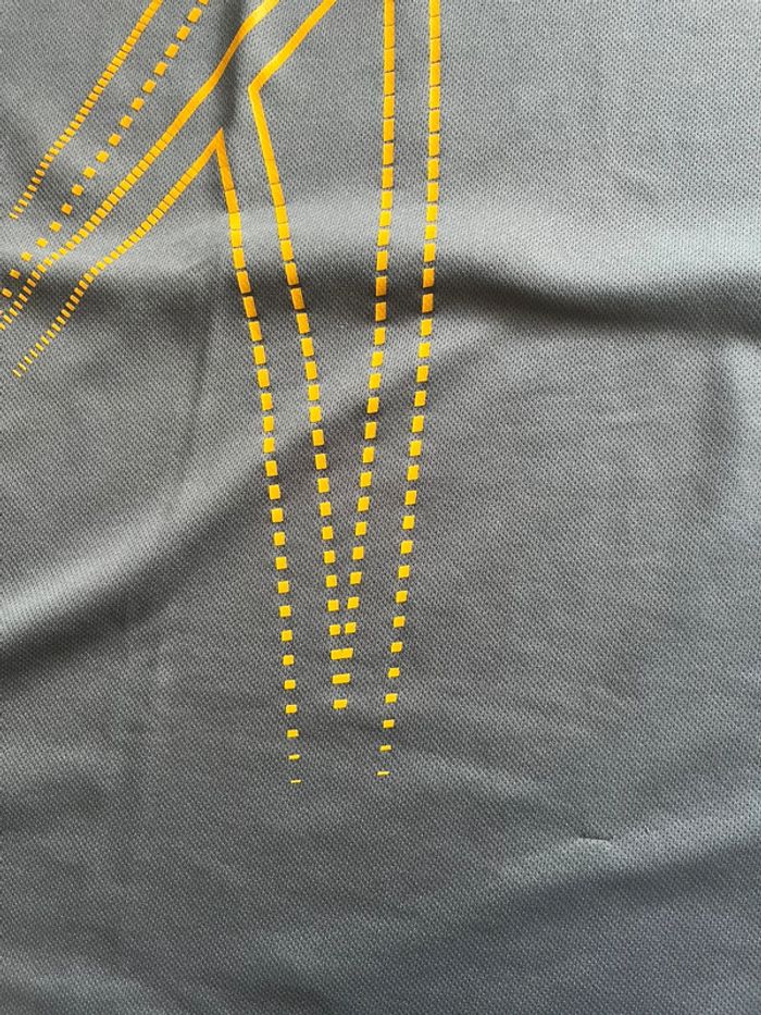 Débardeur de sport gris avec motifs lignes en jaune imprimé côté droit. Marque en jaune sous une aisselle. Taille M (plus lisible) - taille habituellement porté en L, taille bien porté à la bonne taille. Marque : Reebok Matière : 100% polyester Très bon état général. Signe d’usure : quelques accros (1 à l’avant et 2 petites à l’arrière) - voir tout les détails en photos.
