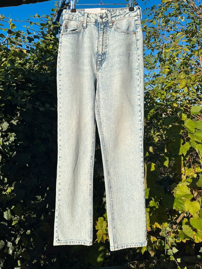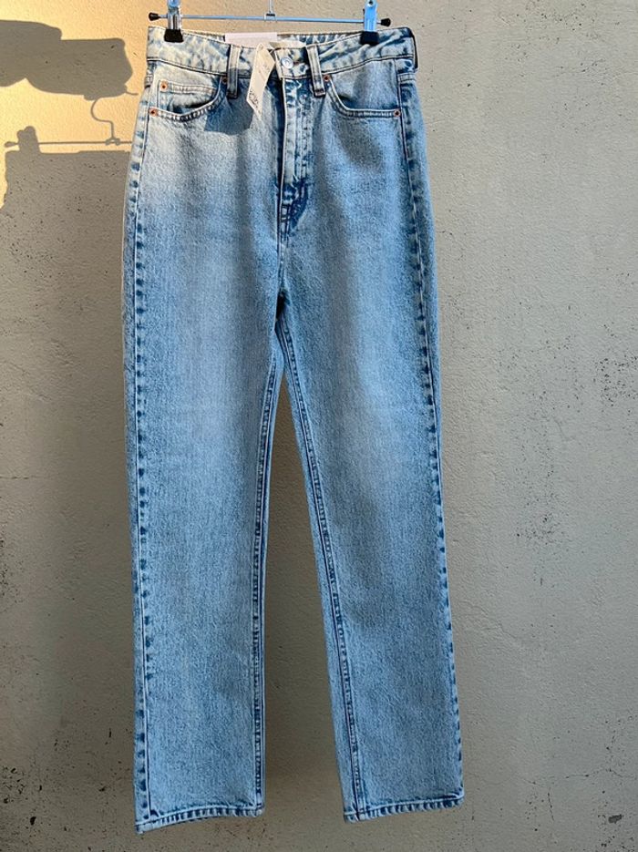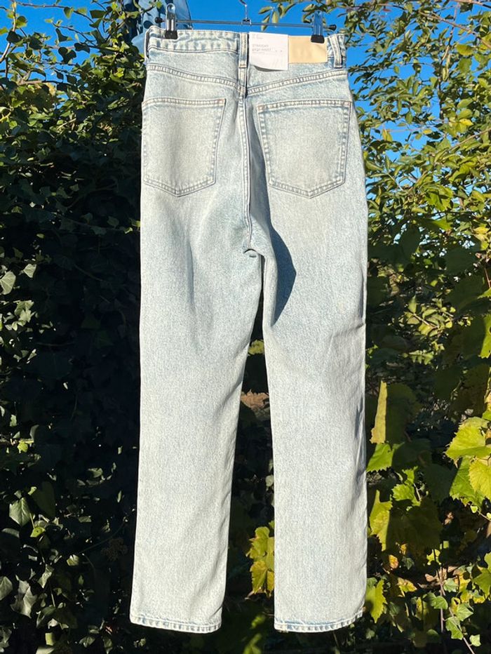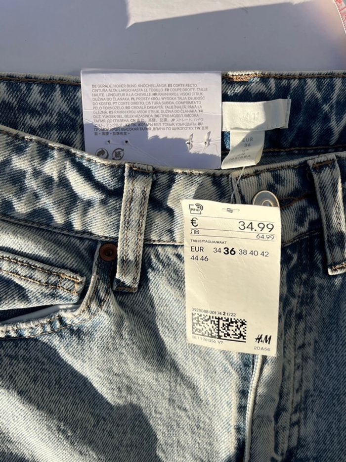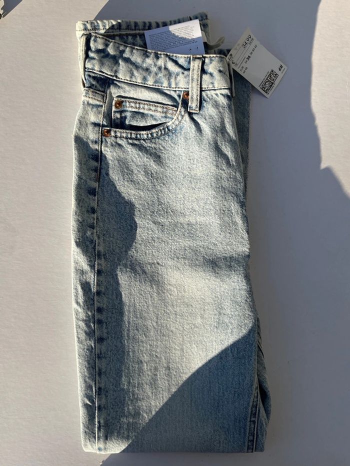 Jeans taille haute coupe droite, couleur bleu clair nuances bleu et blanc effet délavé. Avec fermeture éclair et bouton argenté. 5 poches au total (dont 1 à l’avant). Style Vintage. Taille 36 Taille haute (32 cm) - longueur à la cheville. Marque : H&M - « straight - high waist - ankle length » Neuf, jamais porté. Aucun signe d’usure. 👖plusieurs jeans dans le dressing et réductions sur les lots 🎁 idée cadeau de Noël