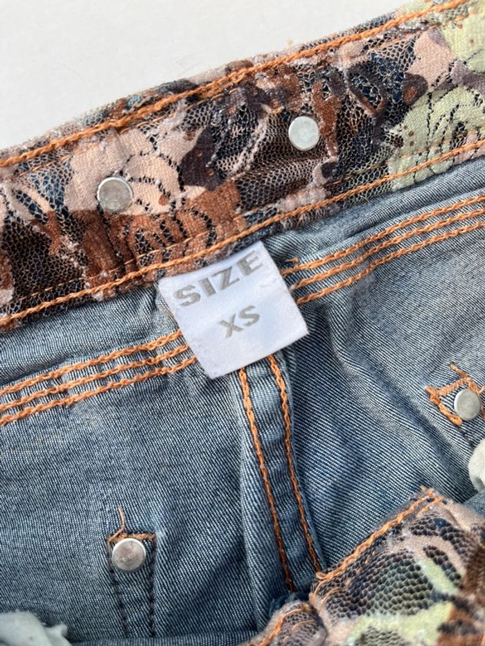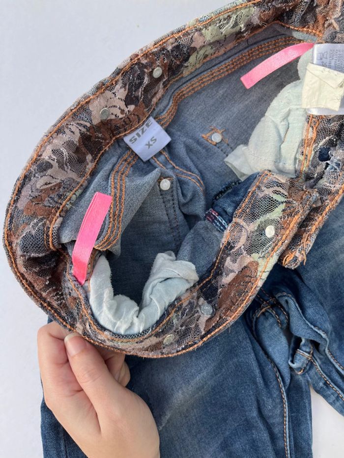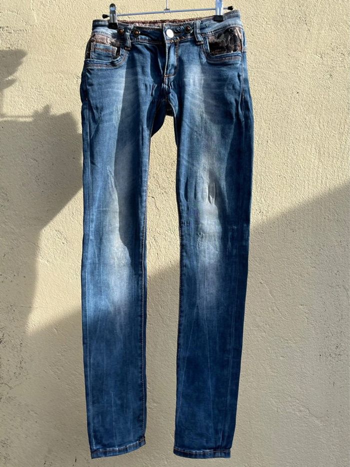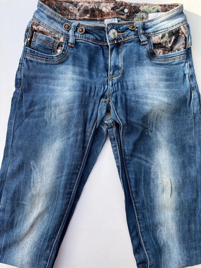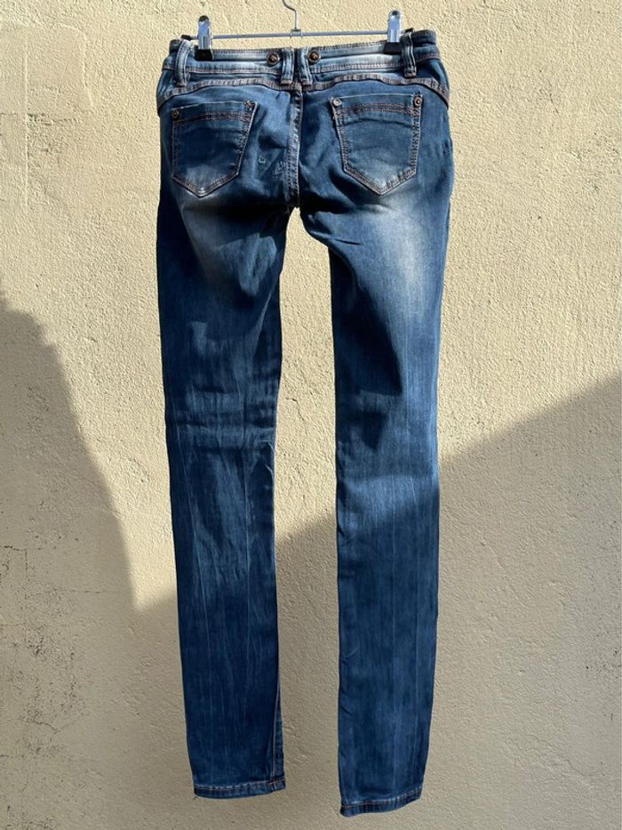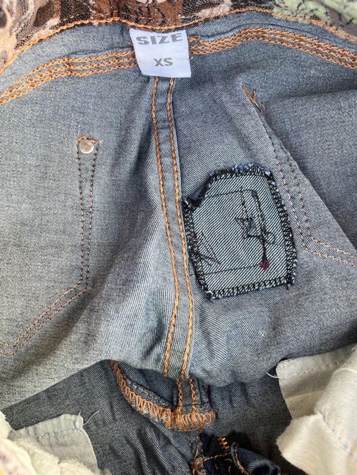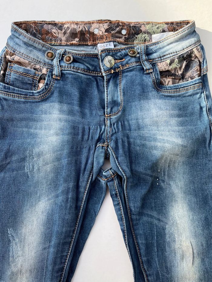 Jeans taille basse coupe skinny slim moulant couleur bleu avec nuance de bleu clair / blanc et touches de dentelles motifs fleurs couleur marron, beige et vert - effet griffures / éraflures avec strass paillettes - boutons décoratifs au niveau de la ceinture en strass marron. Avec fermeture éclair et bouton argenté doré. 5 poches au total (dont 1 petite à l'avant). Style vintage - année 2000 y2k Taille XS correspondant à un 36 Mesures prises à plat : Du bouton à l'entre-jambe : 17 cm Taille : 35 cm (stretch) Longueur à partir des hanches : 101 cm Longueur à partir de l'entre jambes : 83,5 cm Marque : sans marque - vintage Bon état général - porté plusieurs fois. Signe d'usure : accros et troue à l’arrière qui a été repris + un bouton décoratif sur la poche arrière manquant, un bouton décoratif à l’avant (où on met une ceinture) qui manque et troue à côté de l’autre bouton mais peu visible. (voir tout les détails en photos). 👖 plusieurs jeans dans le dressing et réductions sur les lots