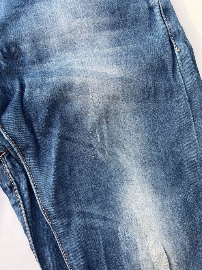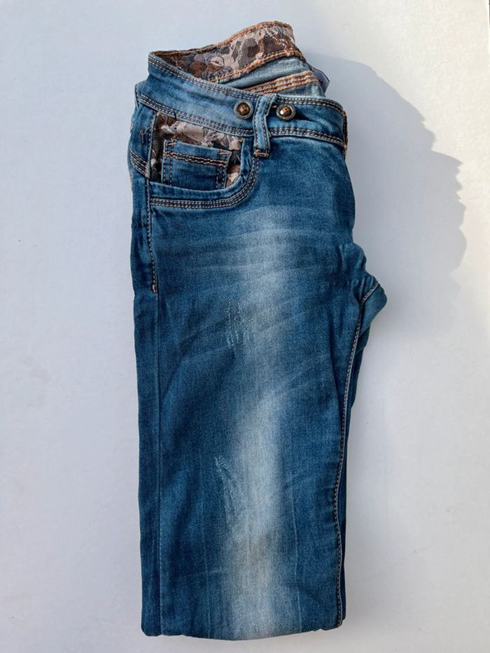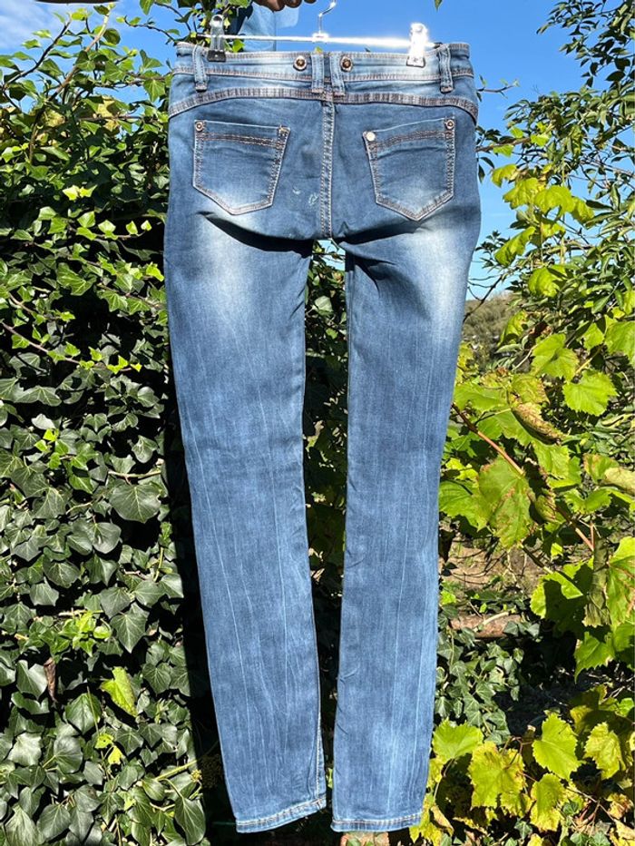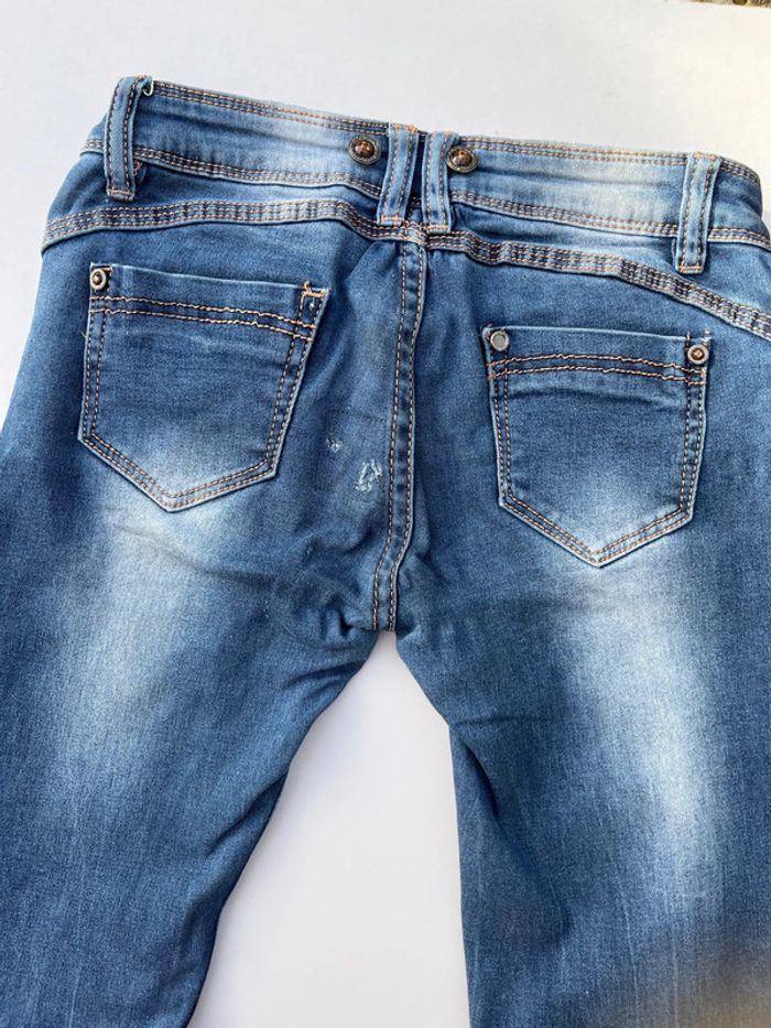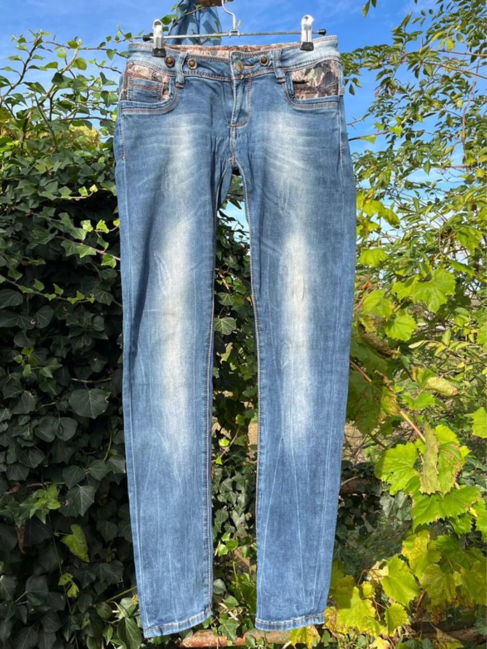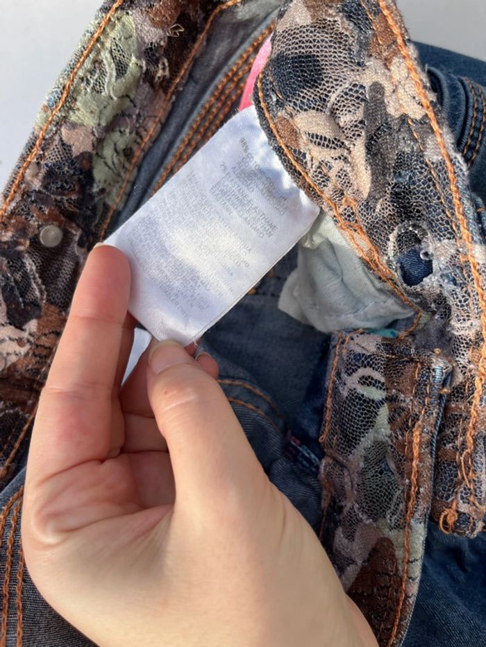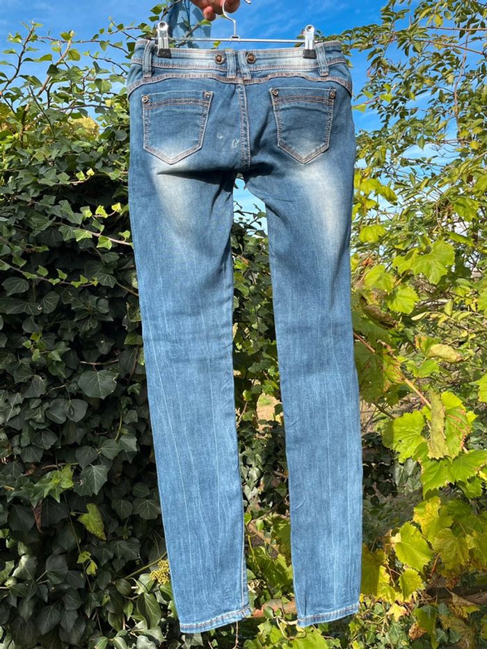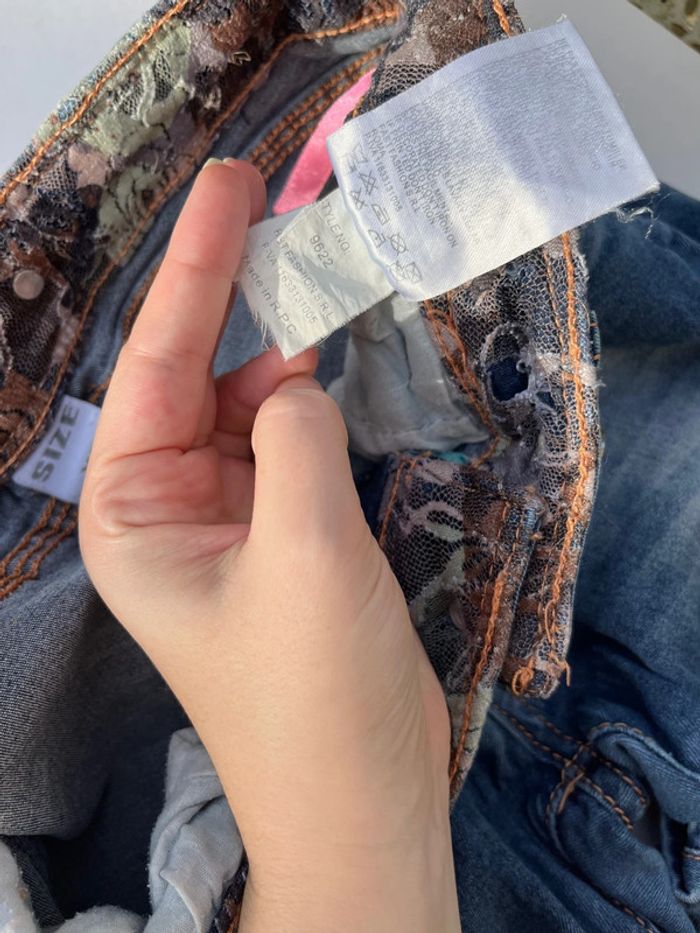 Jeans taille basse coupe skinny slim moulant couleur bleu avec nuance de bleu clair / blanc et touches de dentelles motifs fleurs couleur marron, beige et vert - effet griffures / éraflures avec strass paillettes - boutons décoratifs au niveau de la ceinture en strass marron. Avec fermeture éclair et bouton argenté doré. 5 poches au total (dont 1 petite à l'avant). Style vintage - année 2000 y2k Taille XS correspondant à un 36 Mesures prises à plat : Du bouton à l'entre-jambe : 17 cm Taille : 35 cm (stretch) Longueur à partir des hanches : 101 cm Longueur à partir de l'entre jambes : 83,5 cm Marque : sans marque - vintage Bon état général - porté plusieurs fois. Signe d'usure : accros et troue à l’arrière qui a été repris + un bouton décoratif sur la poche arrière manquant, un bouton décoratif à l’avant (où on met une ceinture) qui manque et troue à côté de l’autre bouton mais peu visible. (voir tout les détails en photos). 👖 plusieurs jeans dans le dressing et réductions sur les lots