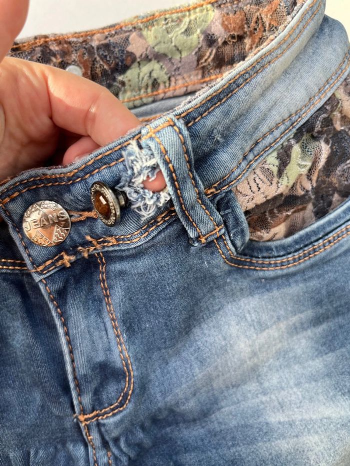 Jean skinny taille basse bleu nuancé avec dentelles fleuris