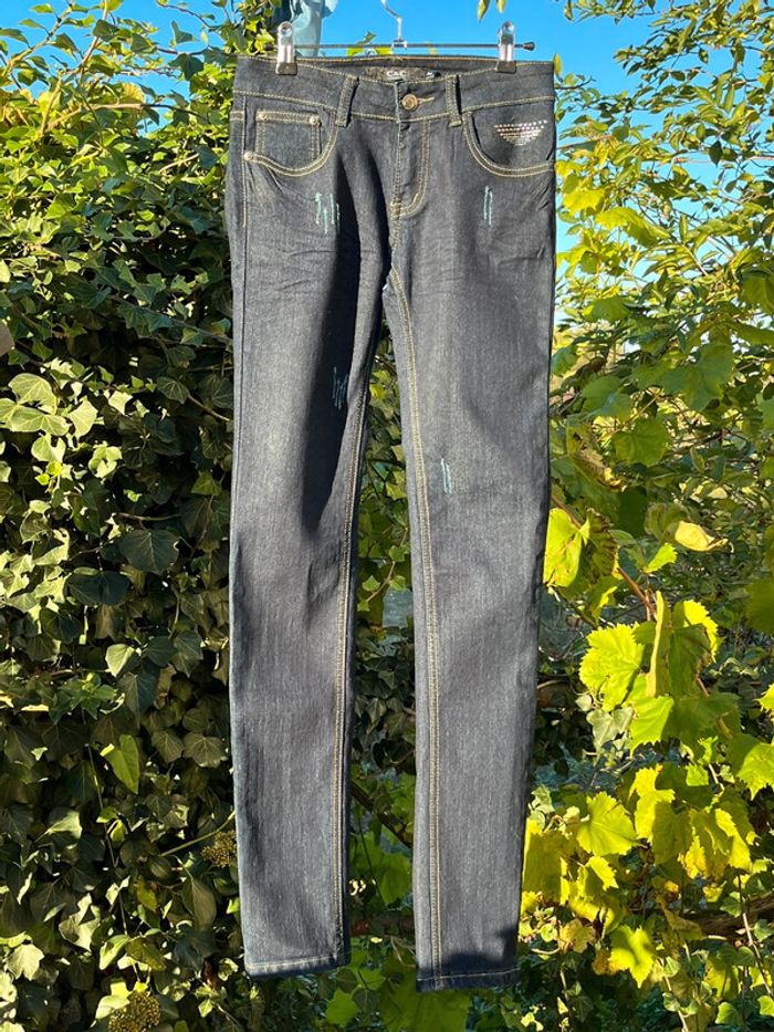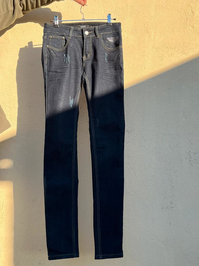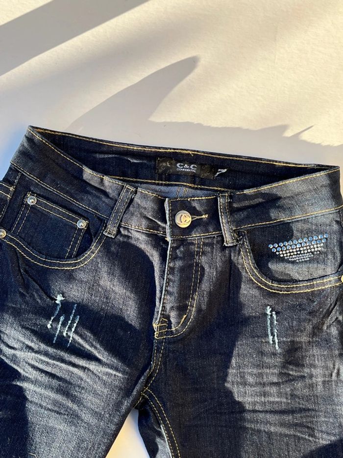 Jeans taille basse coupe skinny slim moulant couleur marine noir - effet griffures / éraflures - strass paillettes argenté à l’avant et arrière au niveau des poches. Avec fermeture éclair et bouton argenté. 5 poches au total (dont 1 petite à l'avant). Style vintage - année 2000 y2k Taille 36 Mesures prises à plat : Du bouton à l'entre-jambe : 19 cm Taille : 35,5 cm Longueur à partir des hanches : 104 cm Longueur à partir de l'entre jambes : 82,5 cm Marque: C&C confidential Très bon état général - porté quelques fois. Aucun signe d'usure. 👖plusieurs jeans dans le dressing et réductions sur les lots