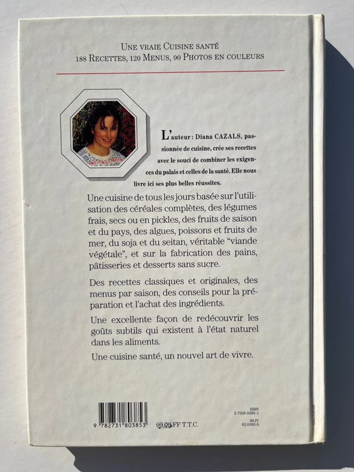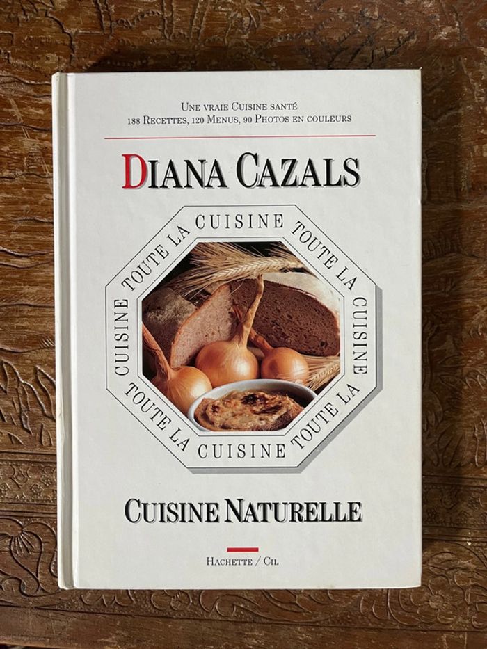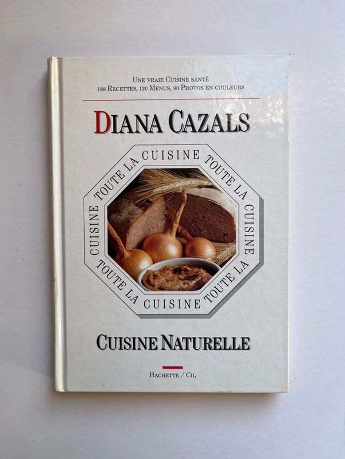 Livre de recettes - Toute la cuisine - Cuisine Naturelle de Diana Cazals Éditions Hachette / Cil 1990 - Ancien livre (en franc) - Vintage « Une vraie cuisine santé 188 recettes, 120 menus, 90 photos en couleurs. L'auteur: Diana CAZALS, passionnée de cuisine, crée ses recettes avec le souci de combiner les exigences du palais et celles de la santé. Elle nous livre ici ses plus belles réussites. Une cuisine de tous les jours basée sur l'utilisation des céréales complètes, des légumes frais, secs ou en pickles, des fruits de saison et du pays, des algues, poissons et fruits de mer, du soja et du seitan, véritable "viande végétale", et sur la fabrication des pains, pâtisseries et desserts sans sucre. Des recettes classiques et originales, des menus par saison, des conseils pour la préparation et l'achat des ingrédients. Une excellente façon de redécouvrir les goûts subtils qui existent à l'état naturel dans les aliments. Une cuisine santé, un nouvel art de vivre. » Excellent etat général - signe d’usure : pages légèrement jaunies par le temps. Voir détails en photos