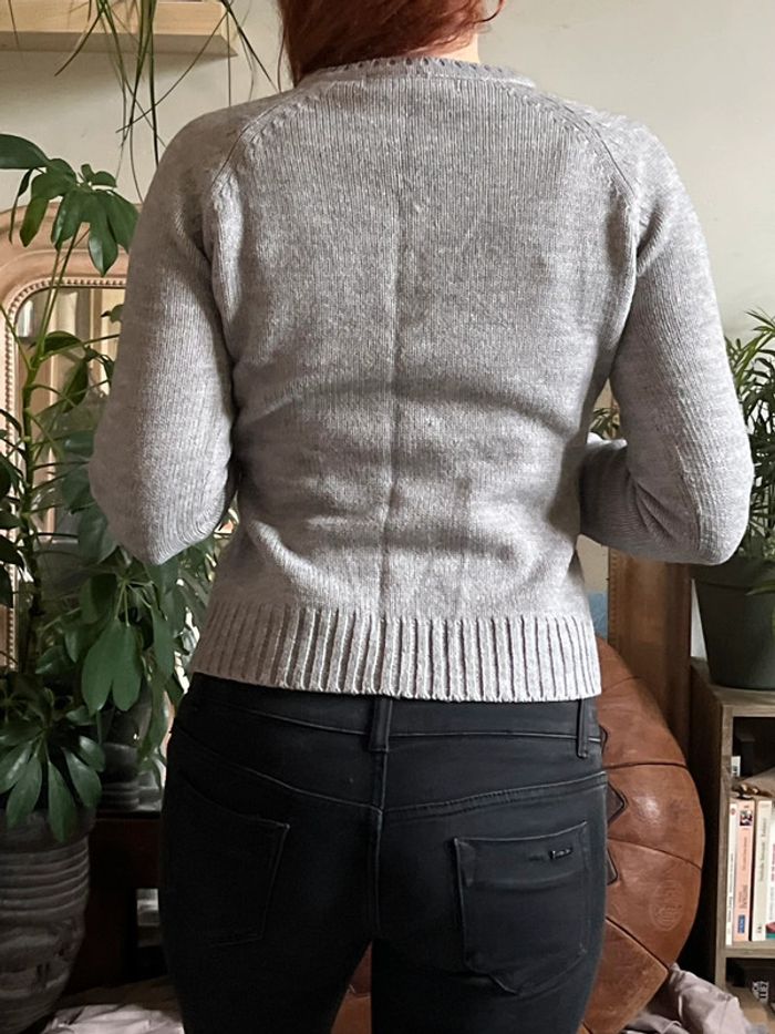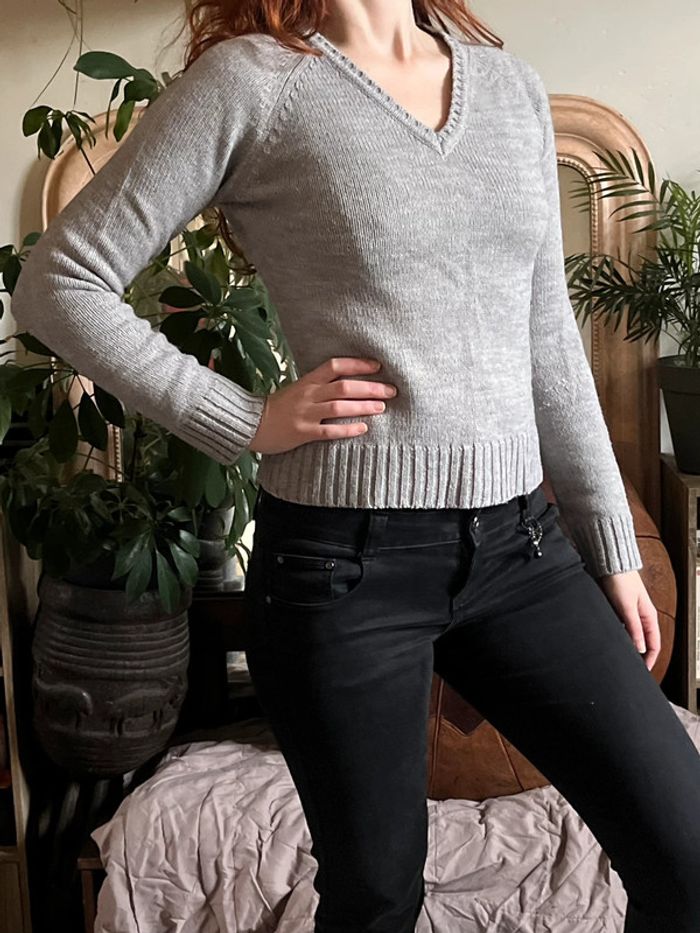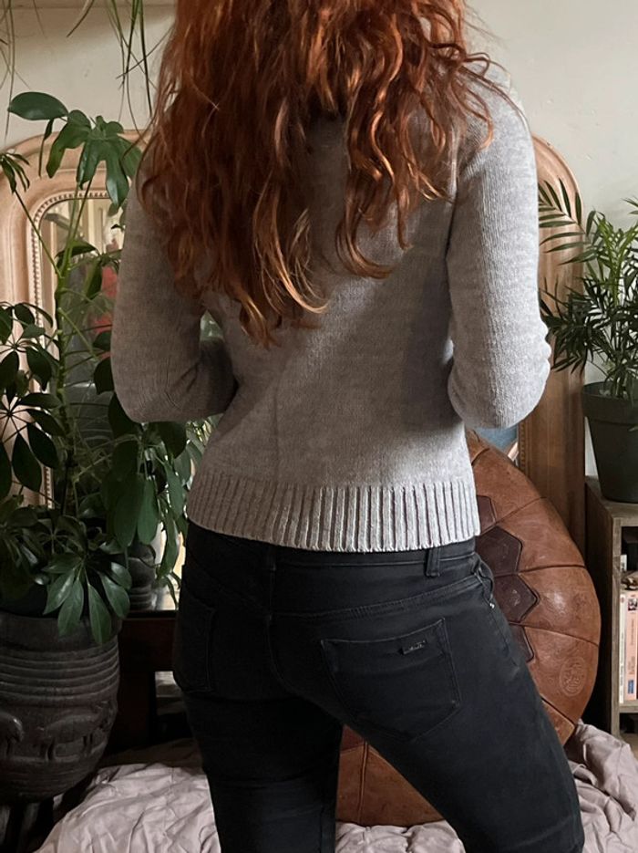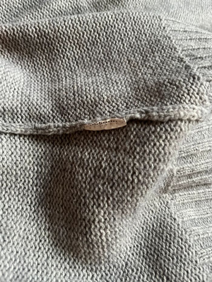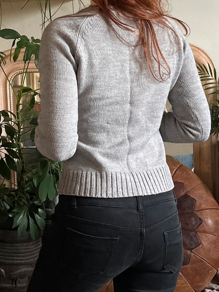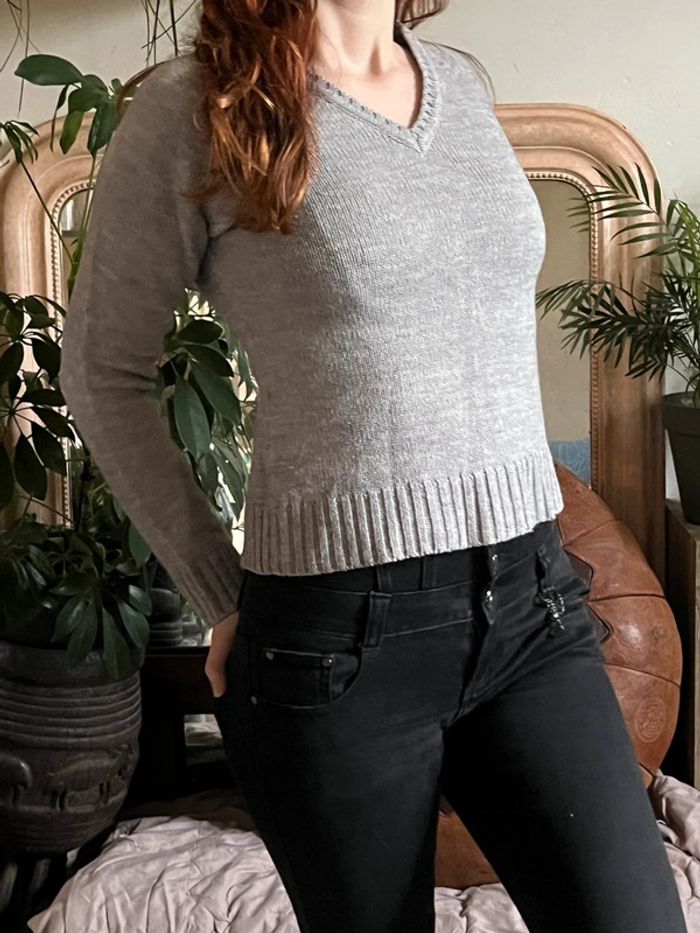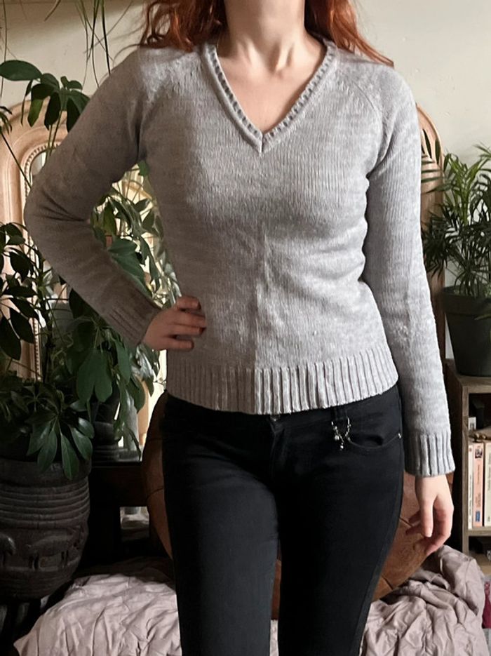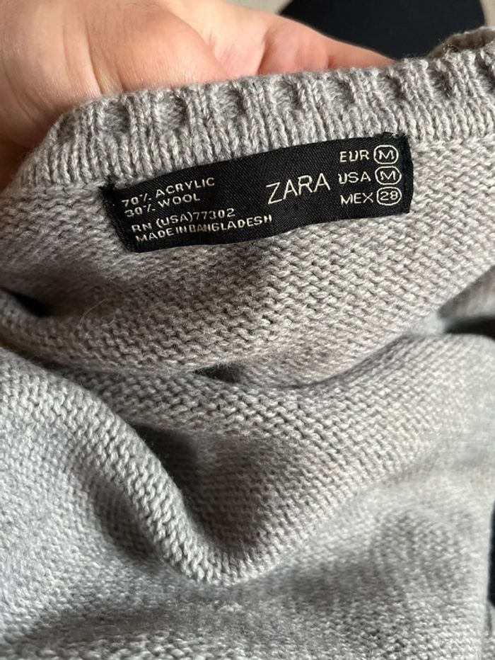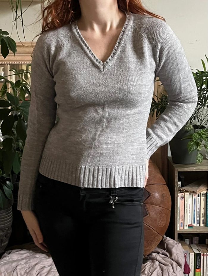 Haut pull d'hiver chaud en tricot maille - décolleté col V. Parties côtelés sur le bout des manches, col et bas du pull - petits motifs avant et arrière sur épaules aisselles. Couleur gris clair. Taille M - je porte du S/M, taille bien. Confortable, tissu épais et agréable. Marque : Zara Très bon état, pas de signe d'usure. Porté quelques fois.