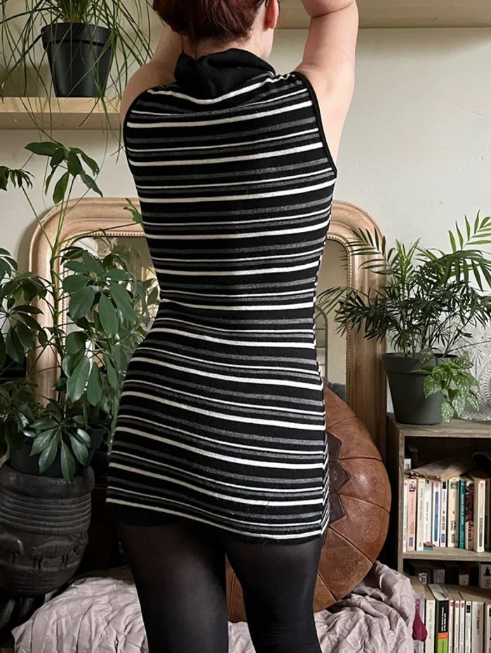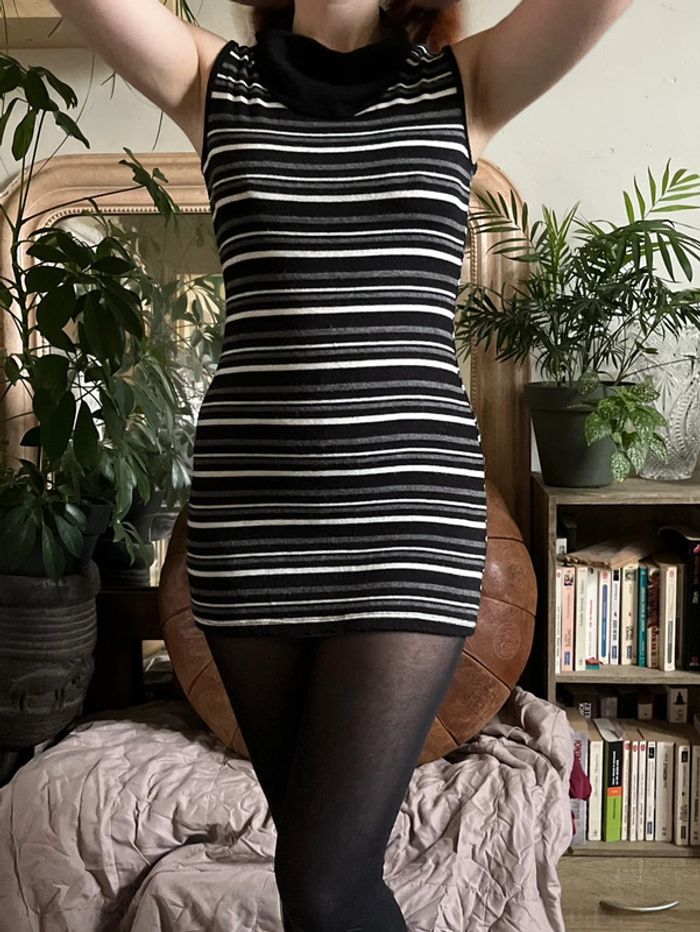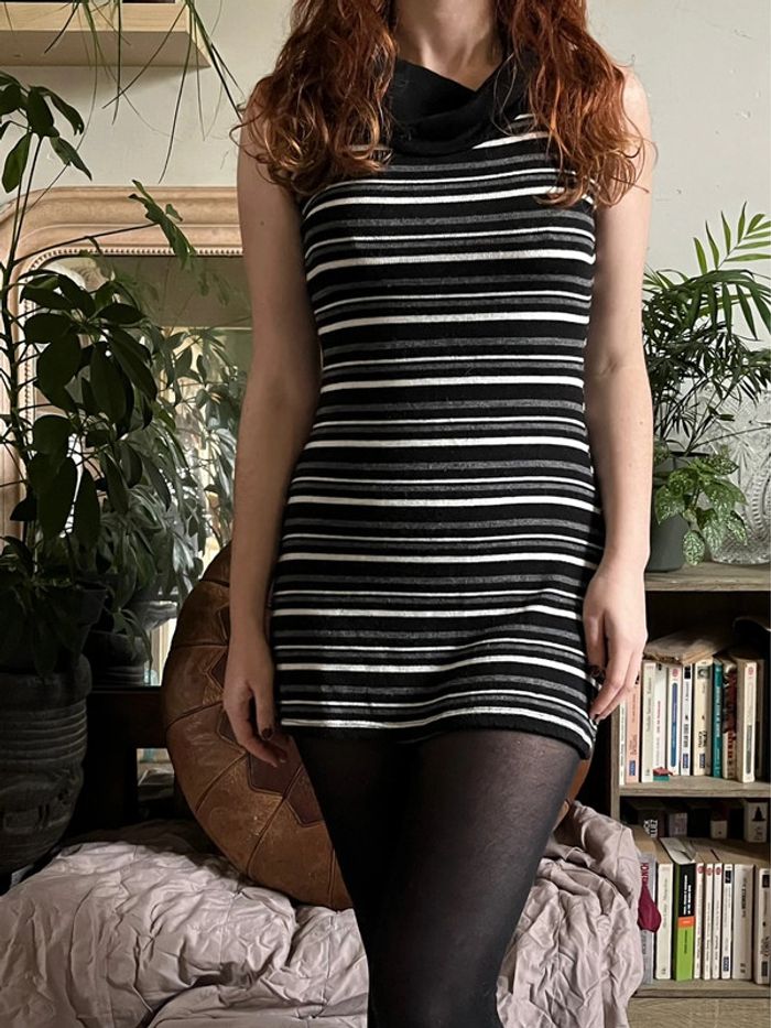 Robe confortable moulante et courte, sans manches - rayures / bandes horizontales fines couleur noir, gris et blanc. Col roulé fluide, qui « retombe » - couleur noir Taille XS/S - je porte du S/M et mesure 1,69m, légèrement serré et courte pour moi. Pas d’étiquette de taille. Marque : Inconnu - Made in Italy Style Vintage, y2k Portable en hiver mais aussi en toutes saisons, pour tout les jours ou occasions. Marque la taille et met les formes en valeur. Très bon état général, aucun signe d'usure. Porté moins de 5x.