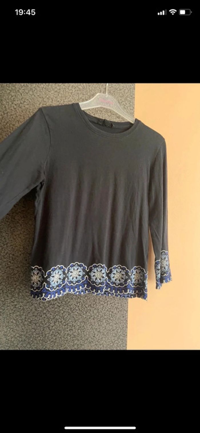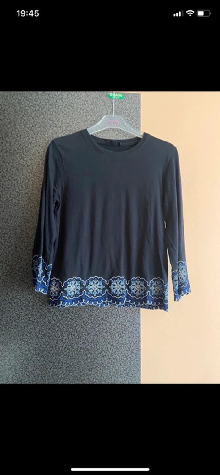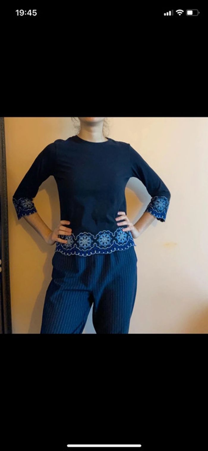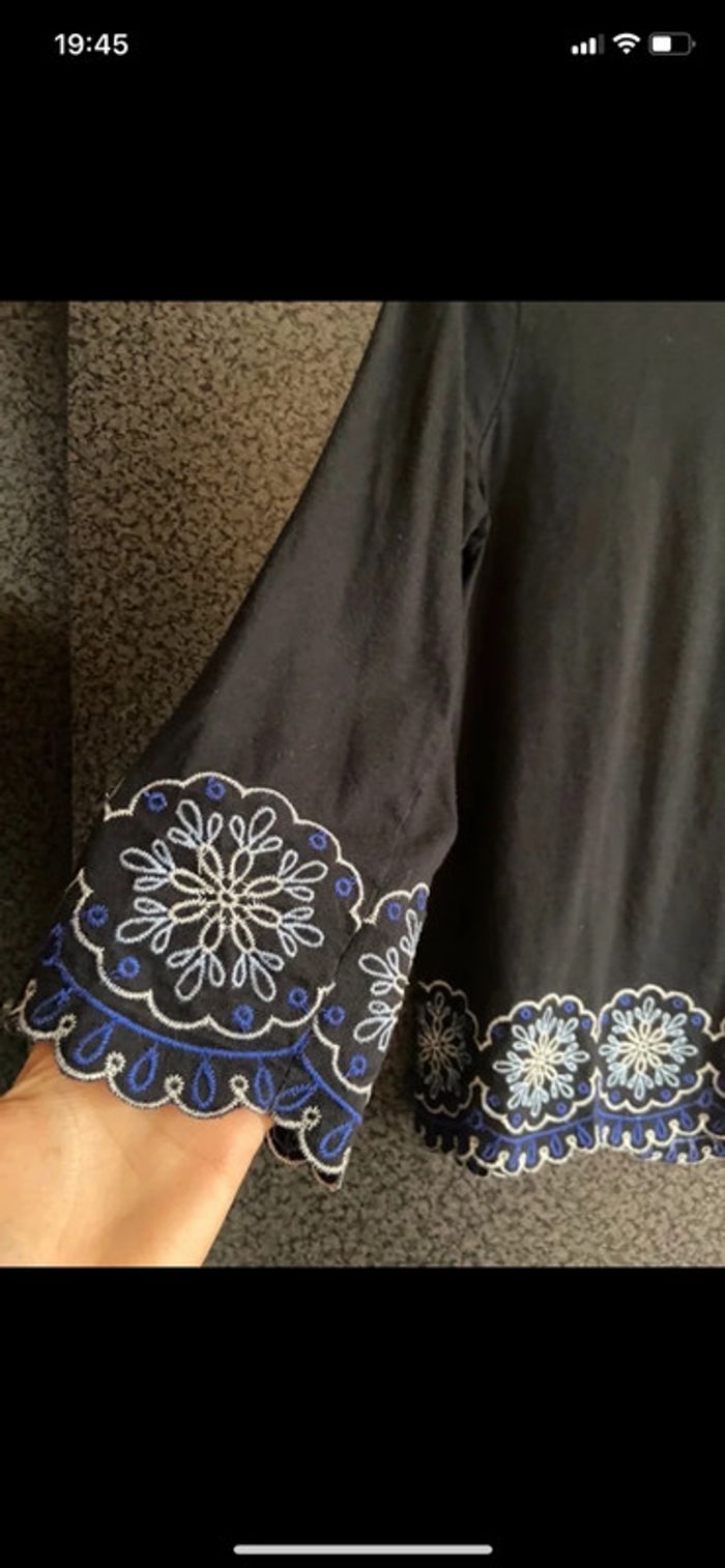 Haut noir Jennyfer court à fleurs bleues sur le bas. Manches 3/4. Échange en main propre possible. #hautfemmejennyfer #hautnoirjennyfer3436 #hautmanches3quart #hautmanchestroisquart