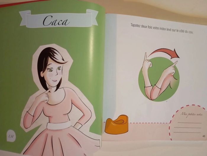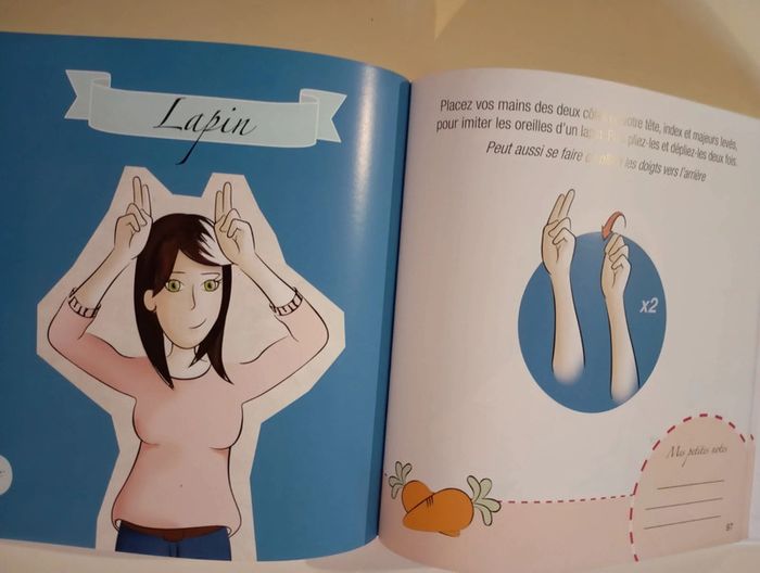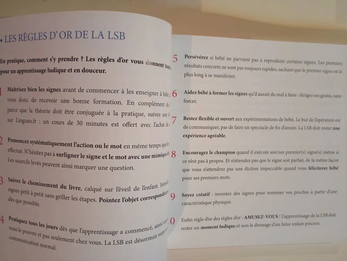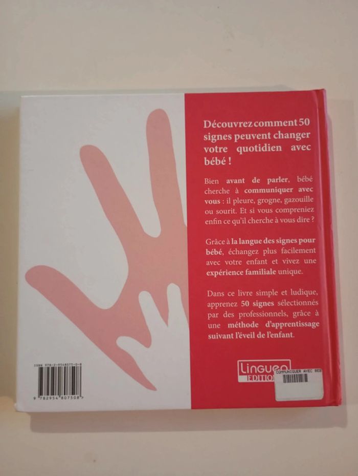 Avec la langue des signes pour bébé, découvrez comment 50 signes peuvent changer votre quotidien de votre enfant ! Bien avant de parler, bébé cherche à communiquer avec vous : il pleure, grogne, gazouille ou sourit. Et si vous compreniez enfin ce qu’il cherche à vous dire ? Grâce à la langue des signes pour bébé, échangez plus facilement avec votre enfant et vivez une expérience familiale unique. Dans cet ouvrage simple et ludique, apprenez 50 signes sélectionnés par des professionnels, grâce à une méthode d’apprentissage suivant l’éveil de l’enfant. Simplicité, concision et méthode d’apprentissage calquée sur l’éveil de l’enfant. 50 signes ont été sélectionnés pour 5 étapes tout en douceur. Éditeur ‏ : ‎ Lingueo Editions 130 pages Livre en excellent état #languedessignes #lsf #communication #signeravecbébé