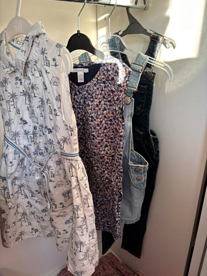 Lot de 10 vêtements - 2 robes -1 Combishort - 1 salopette - 2 jupes -3 pantalon - 1 pantacourt Blanc. Différentes marques : Okaïdi, Levis, tissaia, tape-à-l’œil, vers Maudet, qui a mis, sergent Major