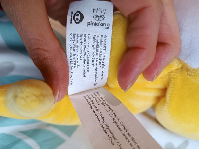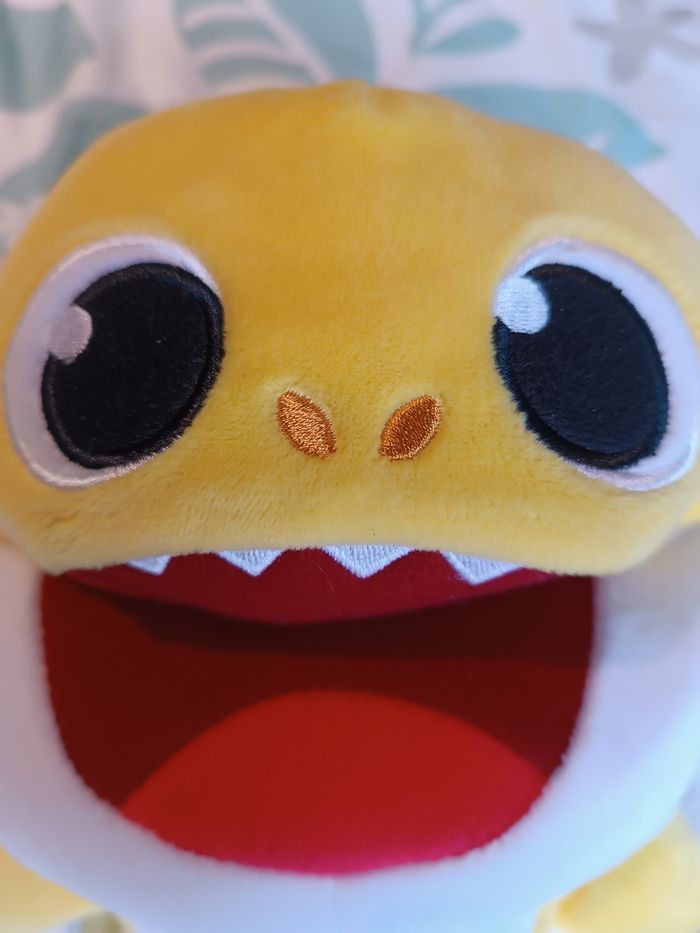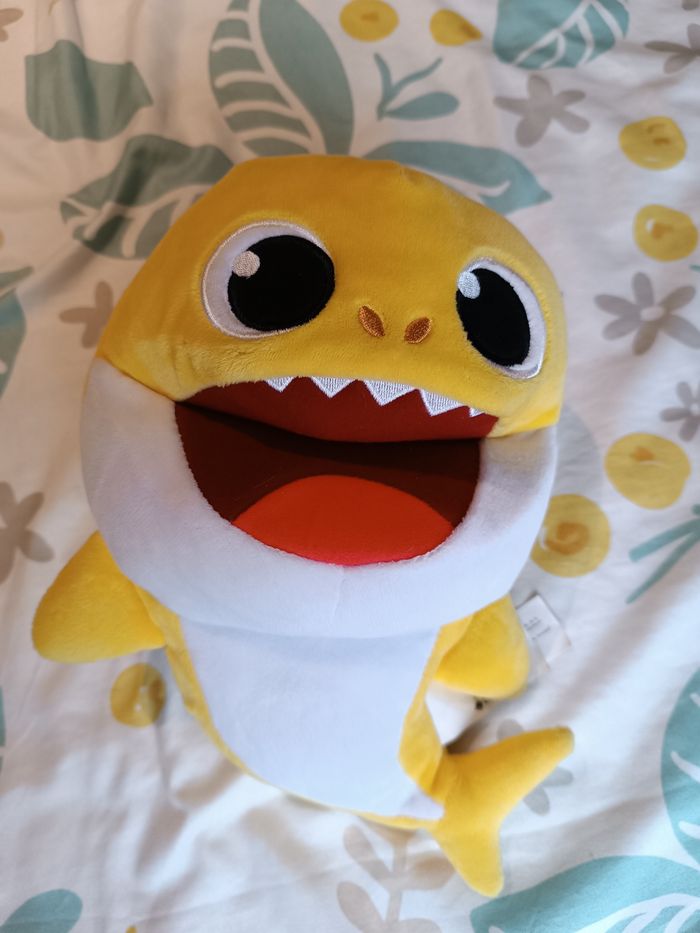 Peluche marionnette Baby Shark de Nickelodeon Pinkfong qui chante la chanson à la vitesse selon laquelle on lui bouge la bouche. Environ 28 cm les piles fonctionnent toujours