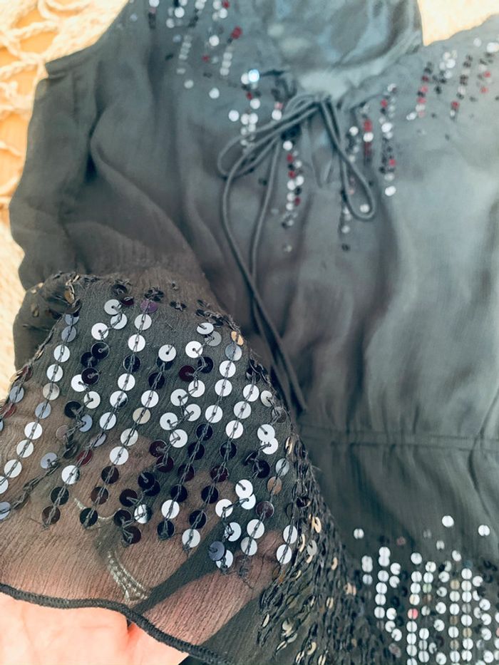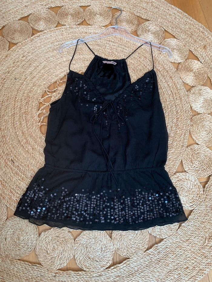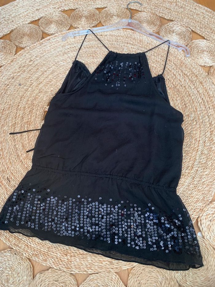 Débardeur noir en voile et sequins noirs effet festif avec sequins Le col et Les bretelles sont réglables 👌🏼 Facile à porter en toutes circonstances, fêtes, soirées, mariage Taille S/M #hautdesoiree #topsoiree36 #topsoirée38 #bedardeurfemme #fete #soirées #ceremonie #cérémonies #mariage