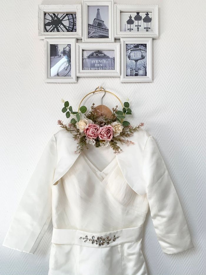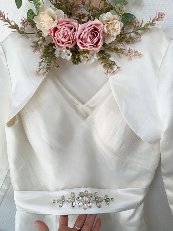 Robe de cérémonie pour mariage Mairie Idéal pour Mariage civile Joli travail de tulle blanche, jupe satinée avec son boléro pour couvrir les bras selon votre goûts. Taille 38