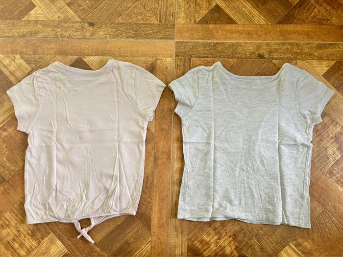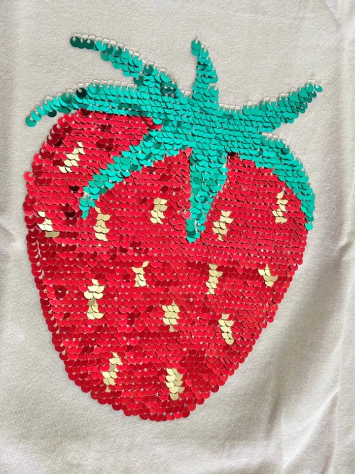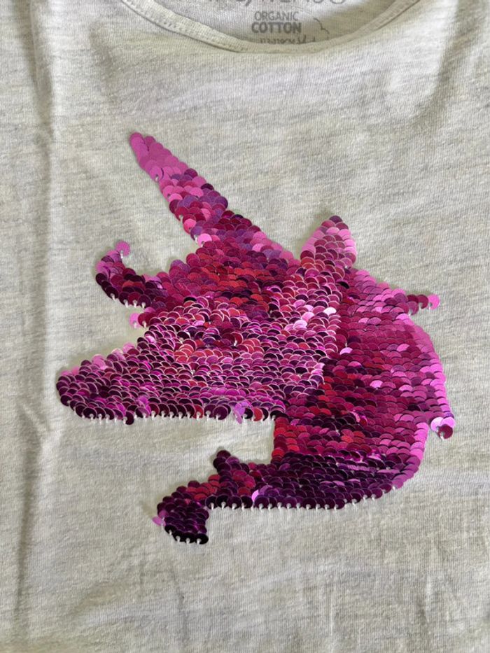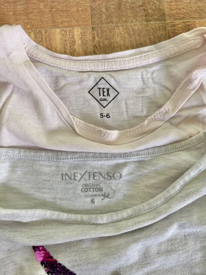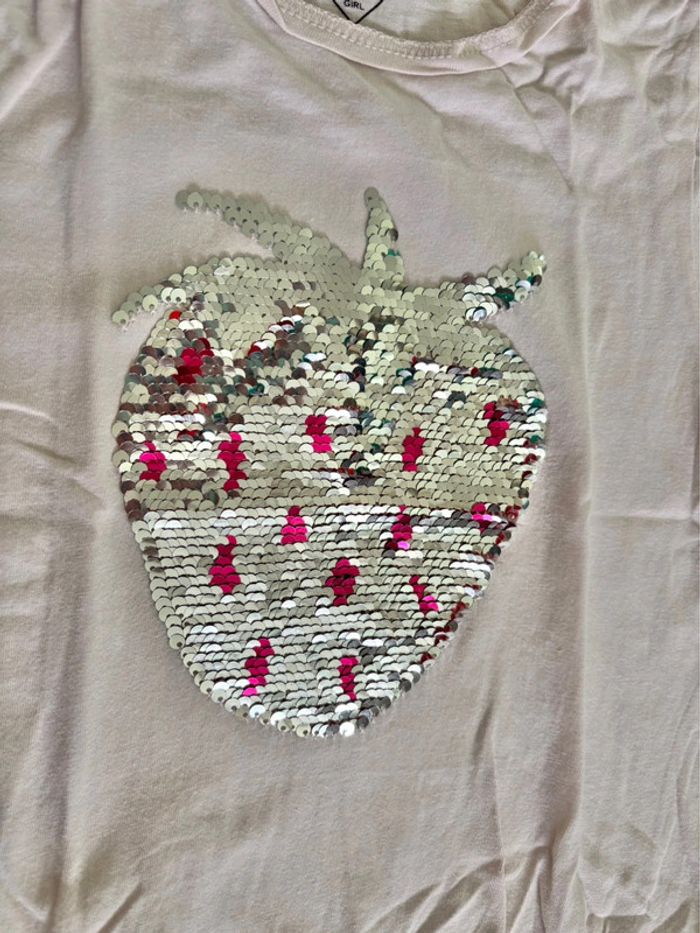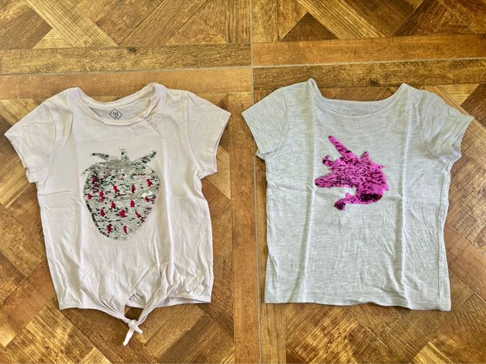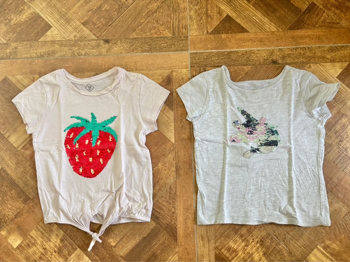 Deux tee-shirts manches courtes Un rose clair avec bas à nouer et motif fraise en sequins magiques Taille: 5/6ans Marque: Tex Un gris clair motif licorne en sequins magiques Taille: 6ans Marque: In Extenso Convient aux jumelles