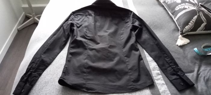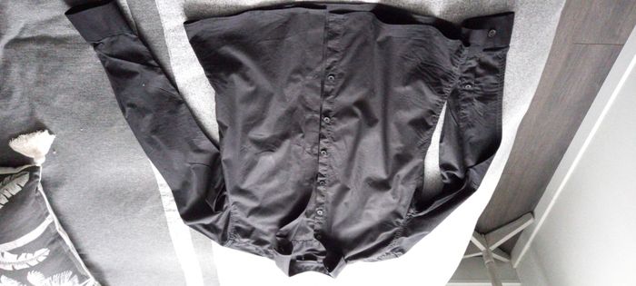 Chemise noire ASOS Manches longues Cintrée dans le dos 97 % coton 3 % elasthanne Longueur 58 cm Longueur manches 63 cm Largeur épaules 43 cm Largeur aisselles 48 cm Taille XXS #homme_imoddeco #T34_imoddeco