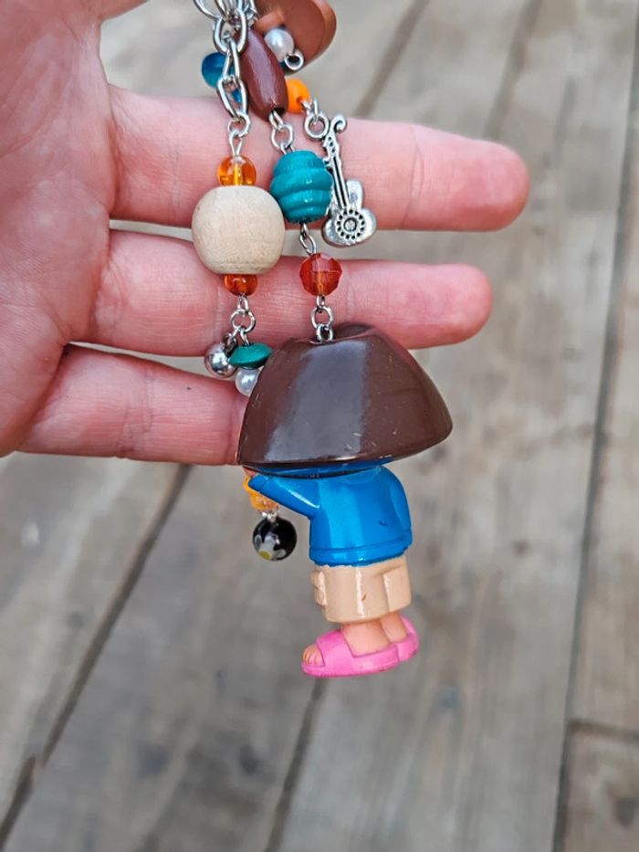 Bijou de sac porte clé Figurine dora l'exploratrice Avec perles de différentes matières et couleurs (bleu, marron,beige, orange) Pendentifs guitare et chapeau Très bon état, création unique ➡️ #ursullabuffaybijoux #ursullabuffaydora #creationsdursulla