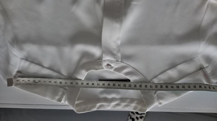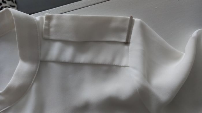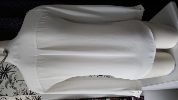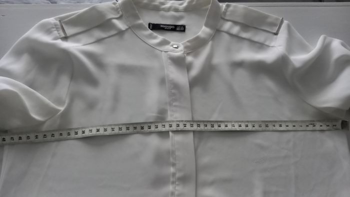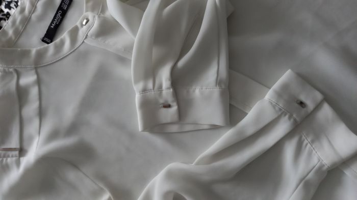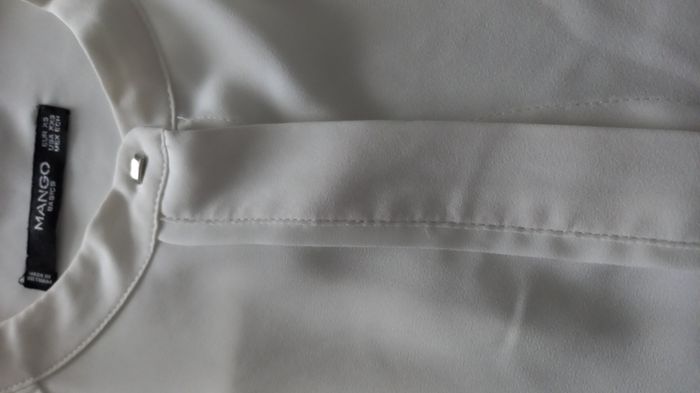 Chemisier Mango blanc/écru Manches longues Jolis boutons et déco sur épaules Voile léger crêpe Largeur épaules 38 cm Largeur aisselle 48 cm Taille XS Léger défaut au niveau de la poitrine Pratiquement invisible (photo grossie) #T34_imoddeco