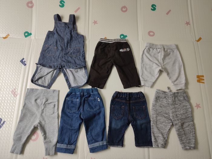 Très bon état 3 joggings 2 pantalons élastique et 1 jeans 1 salopette Marque: bout'chou, pat et ripaton, Kiabi, 3 pommes ...