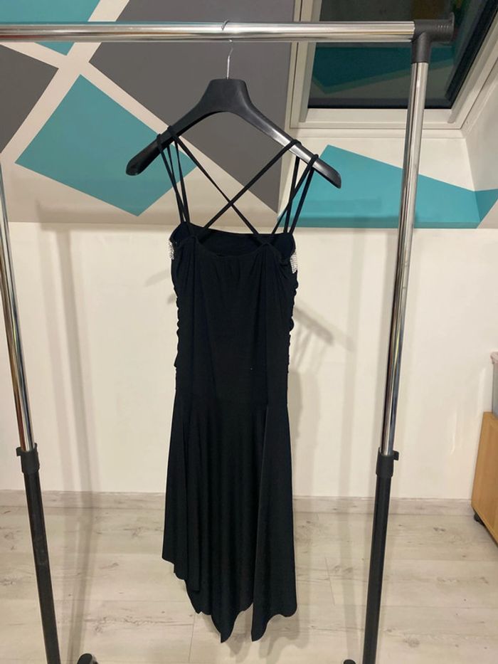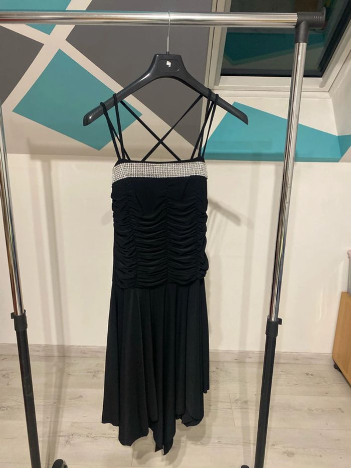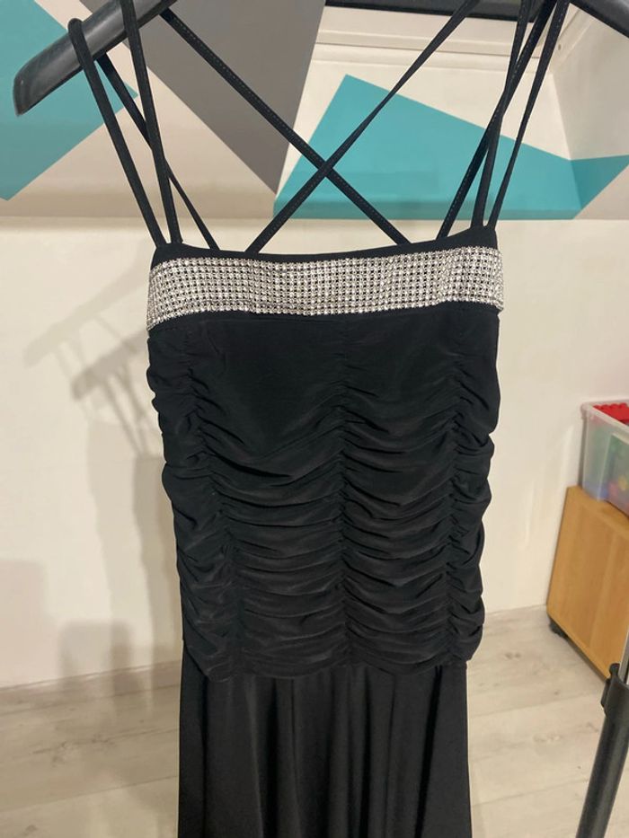 Robe noire à strasse, matière très extensible Large niveau des épaules, environ 38 cm, largeur sous aisselles environ 38 cm largeur au niveau des hanches environ 39 cm. Longueur environ 103 cm. #femmexav