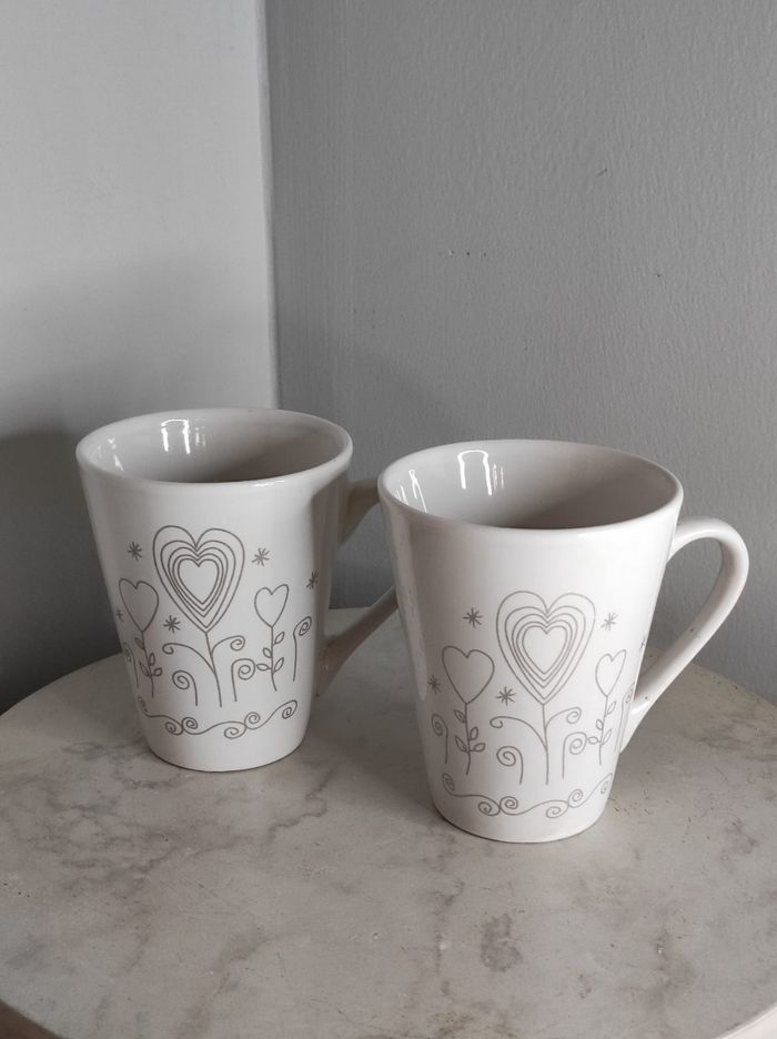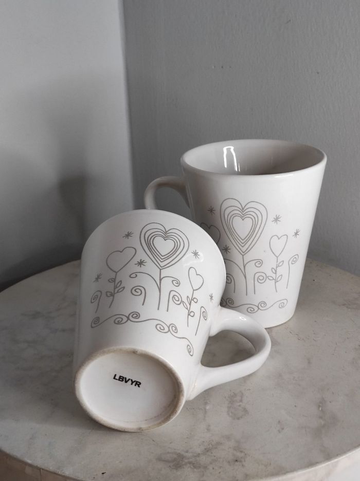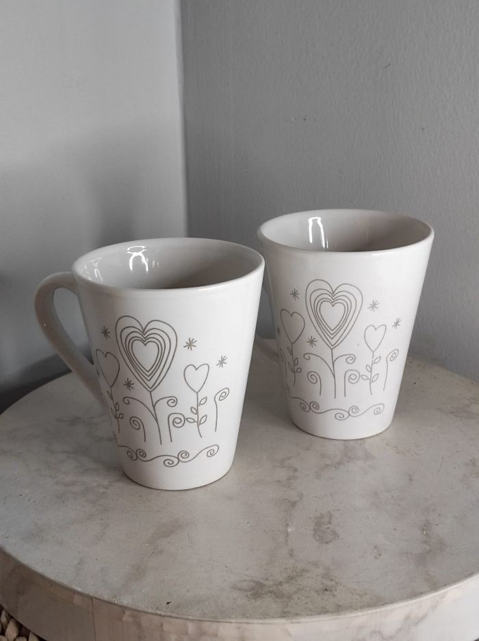 Ensemble de deux tasses / mugs avec un coeur. En bon état général. Dimensions H 10 cm x 8 cm