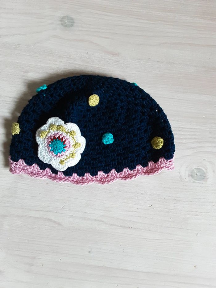 Bonnet fait main tricoté en coton avec fleur T. 4-6 ans