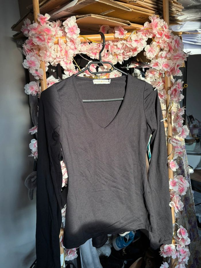 Lot de 2 t-shirt : l’un est en très bon état sans défauts quand au second il a un défauts sur le décolleté et est décousu de quelque point sur une manche (celui-ci est en photo ) 🌸 #claraa250105_taille_s