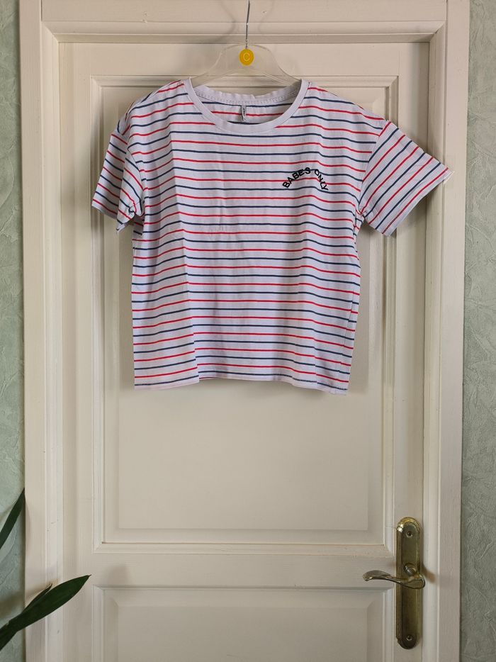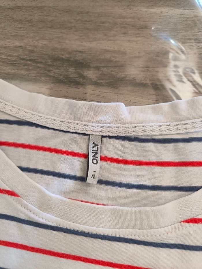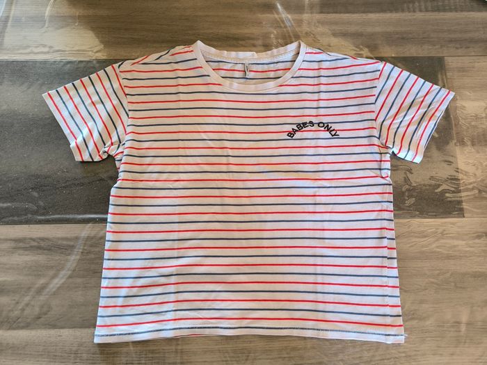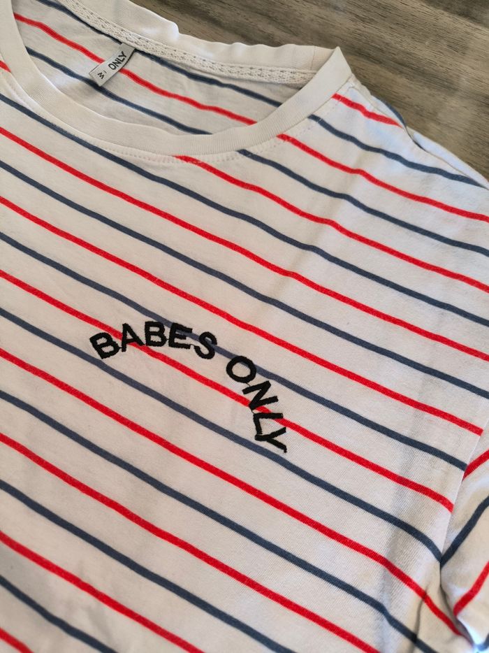 T-shirt à manches courtes Marque Only Taille M, 38 • Coloris blanc, rouge, bleu • Rayures horizontales, style marinière • Broderie "Babes only" • Coton fin Largeur épaule à épaule non étirée : 50 cm Largeur épaule à épaule étirée au maximum : 64 cm Largeur aisselle à aisselle non étirée : 53 cm Largeur aisselle à aisselle étirée au maximum : 67 cm Longueur totale : 53 cm Longueur aisselle : 33 cm En très bon état #evelyne_taille_38