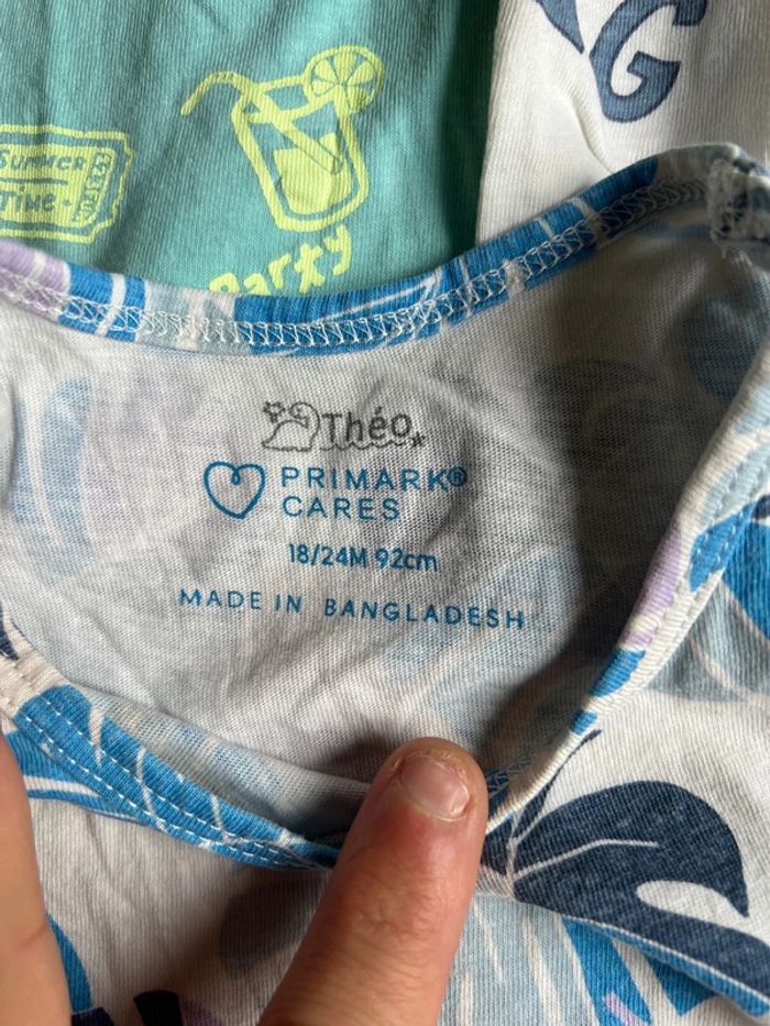 Lot de 5 t-shirt sans manches / débardeurs 3 en taille 12/18mois : - 1 débardeur imprimé « hey cool kid » en parfait état - 1 débardeur imprimé « think big » en parfait état - 1 débardeur à rayures multicolores avec une tache offert (voir photo) 2 en taille 18/24mois : - 1 débardeur imprimés plage 🏝️ en parfait état - 1 débardeur imprimés feuilles 🌿 avec une tache offert (voir photo) Marque : Primark Taille : 12/18 mois - 86cm et 18/24 mois - 92 cm N’hésitez pas de visiter le reste de mon dressing afin d’obtenir des réductions supplémentaires 👍