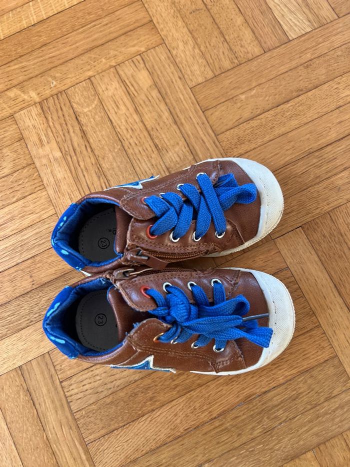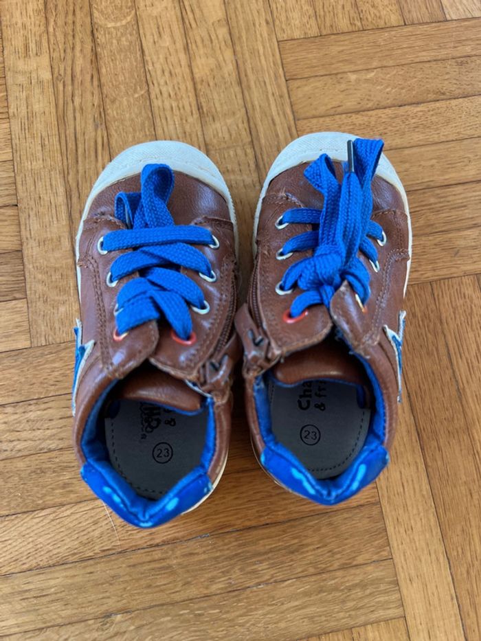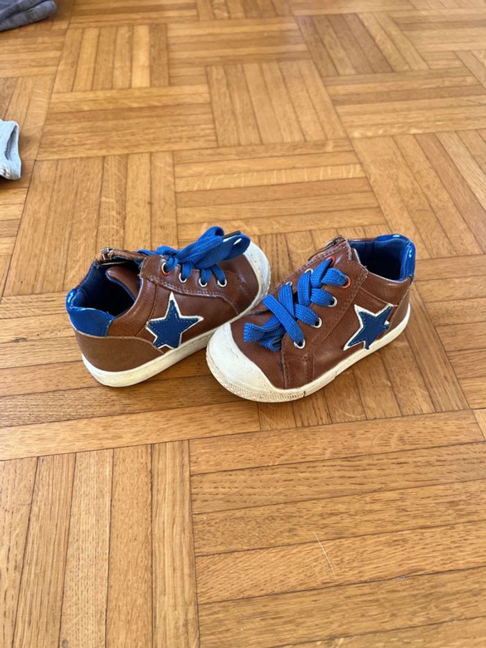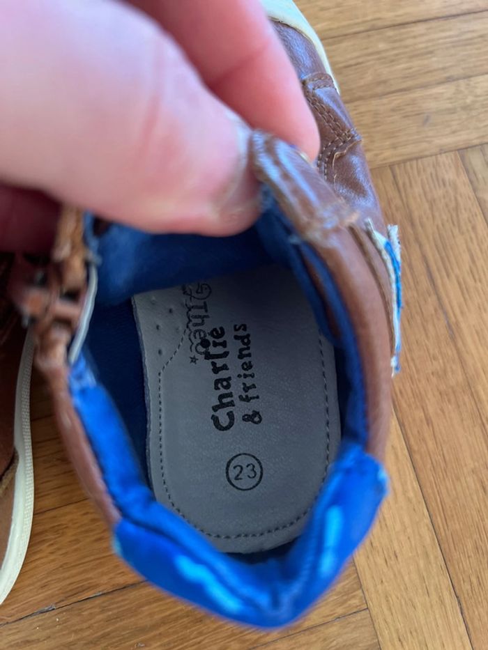Chaussures basket bon état Fermeture éclair et lacets Empiècement étoile bleu sur chaque pied Bon état peuvent encore servir, Légèrement éraflé sur le renfort arrière de chaque chaussures (voir photo) Marque : Charlie & friends Taille : 23