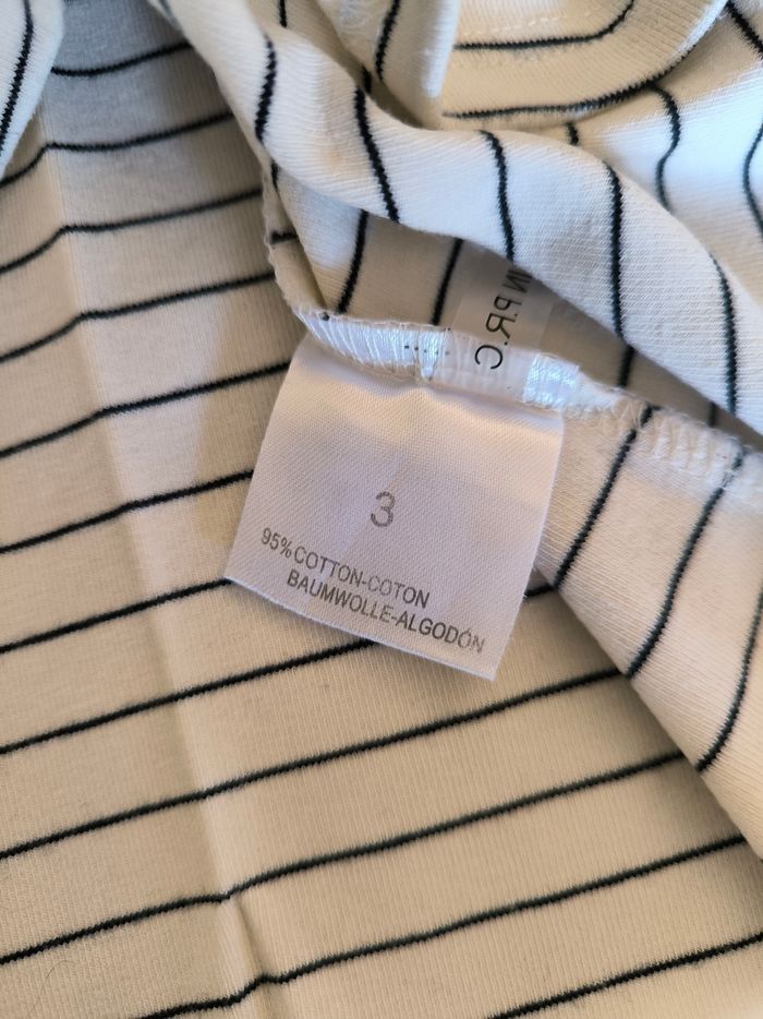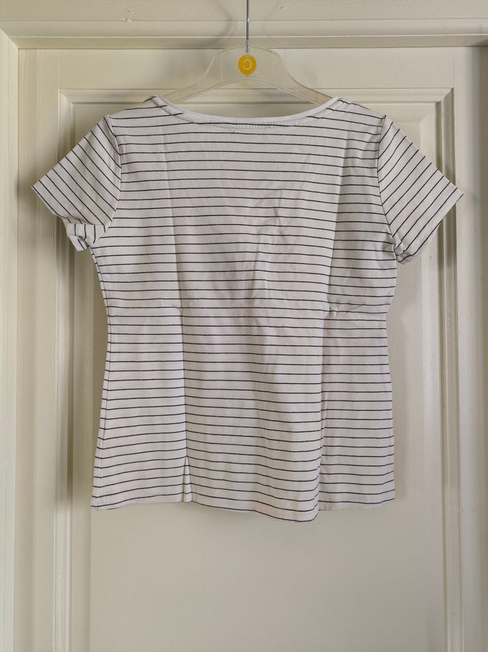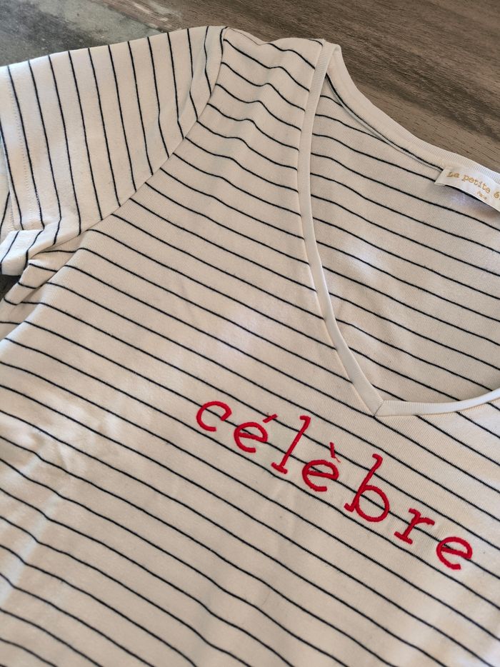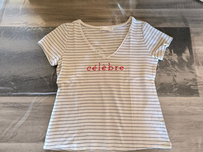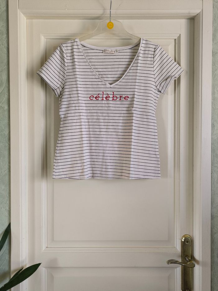 T-shirt à manches courtes Marque La petite étoile Taille 3, 40-42 • Coloris blanc, marine, rouge • Rayures horizontales style marinière • Broderie "Célèbre" • Col V • Coton fin, stretch Largeur épaule à épaule non étirée : 36 cm Largeur épaule à épaule étirée au maximum : 61 cm Largeur aisselle à aisselle non étirée : 45 cm Largeur aisselle à aisselle étirée au maximum : 82 cm Longueur totale : 55 cm Longueur aisselle : 36 cm Peu porté, en très bon état #evelyne_taille_40 #evelyne_taille_42