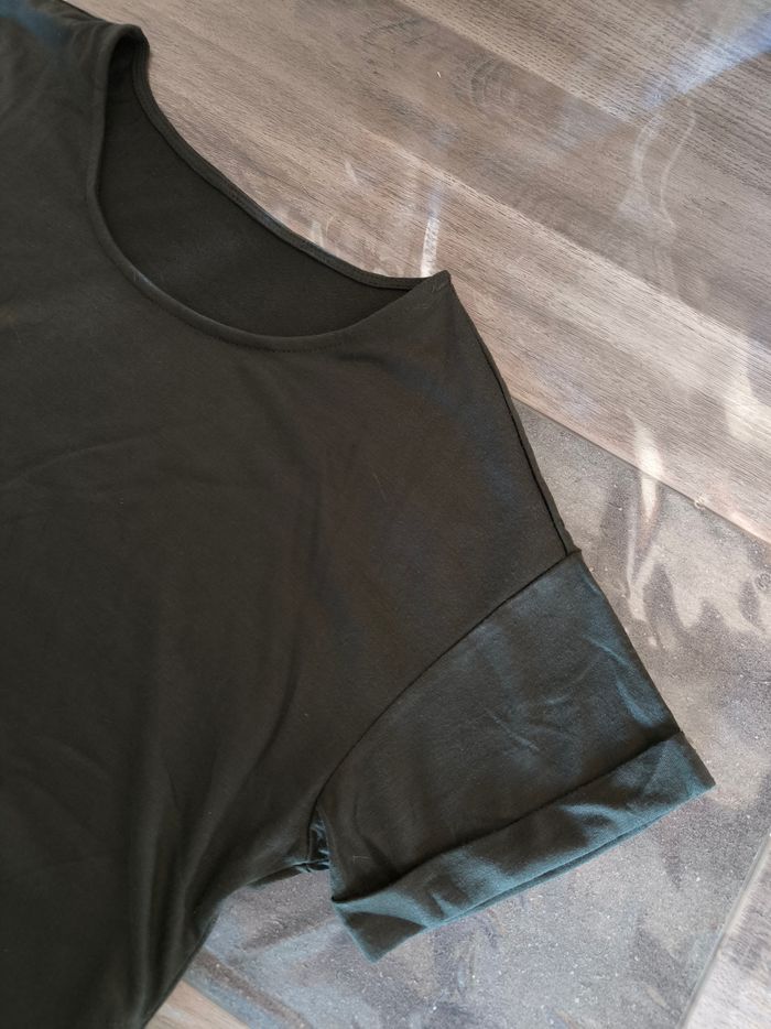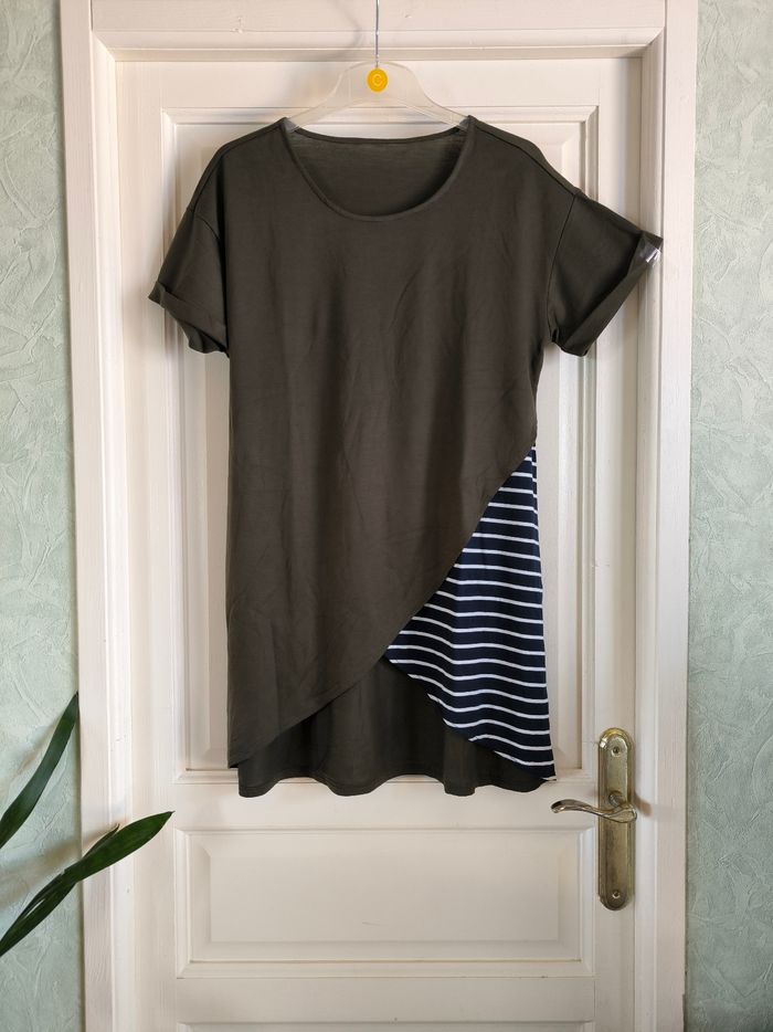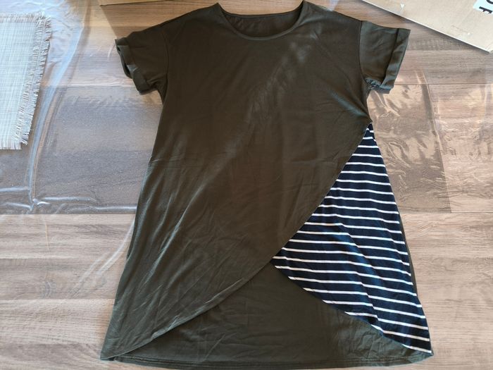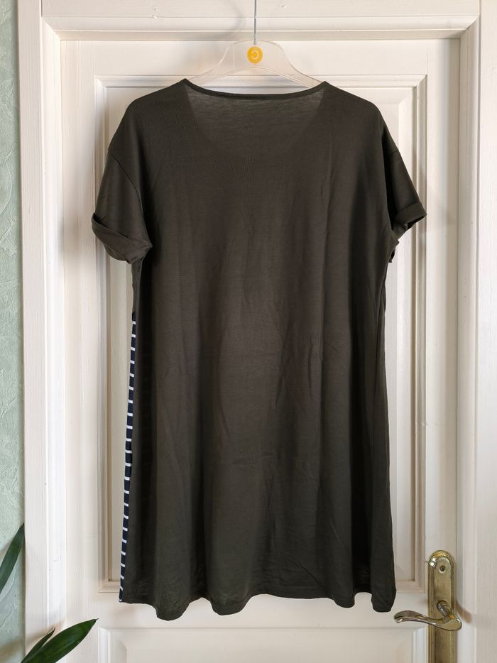 T-shirt long/Tunique à manches courtes Marque Shoo-la-rue Taille M, 38 • Coloris kaki, marine, blanc • Rayures horizontales, style marinière • Ouvert sur le bas • Col rond, bas des manches avec revers • Tissu fin, stretch Largeur aisselle à aisselle non étirée : 53 cm Largeur aisselle à aisselle étirée au maximum : 70 cm Longueur totale : 86 cm Longueur aisselle : 60 cm En très bon état #evelyne_taille_38