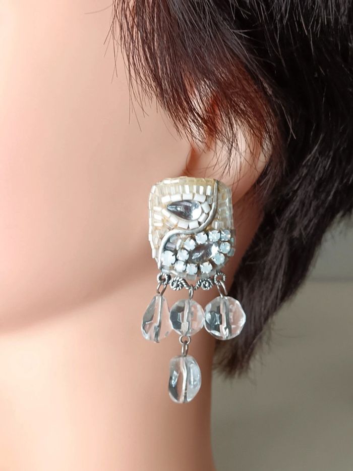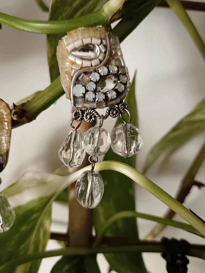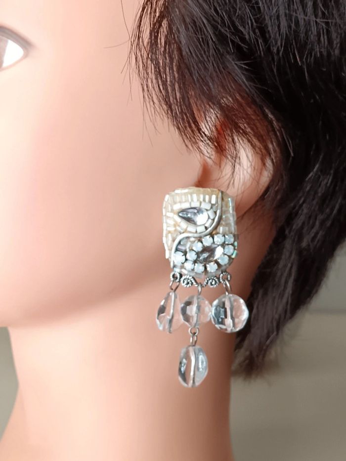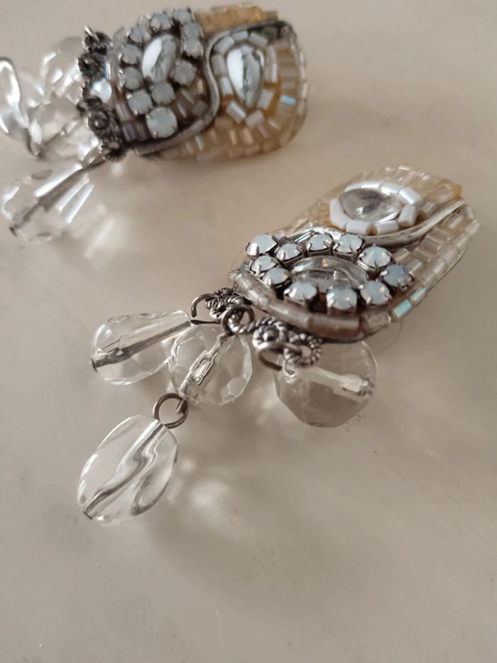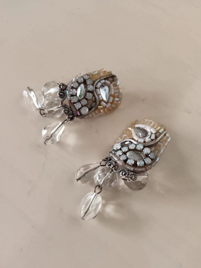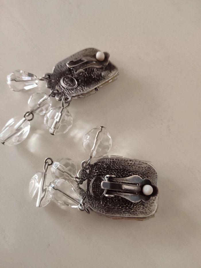 Boucles d'oreilles à clipser vintage. Très graphique art déco. Avec pampilles de perles de verres à facettes #calmbijoux #bouclesdoreillesvintage