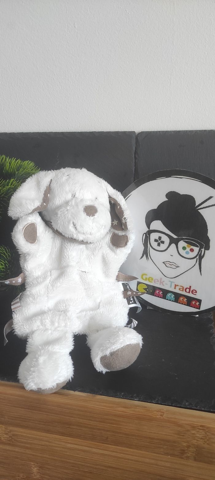 Peluche doudou marionnette chien blanc marron Influx étoile rond bandana cora