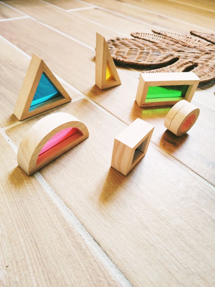 ▶️Construire, empiler, trier, comparer, mélanger les couleurs mais aussi développer l' eveil sensoriel en mettant les formes à la lumière cela projette les couleurs dans la pièce.