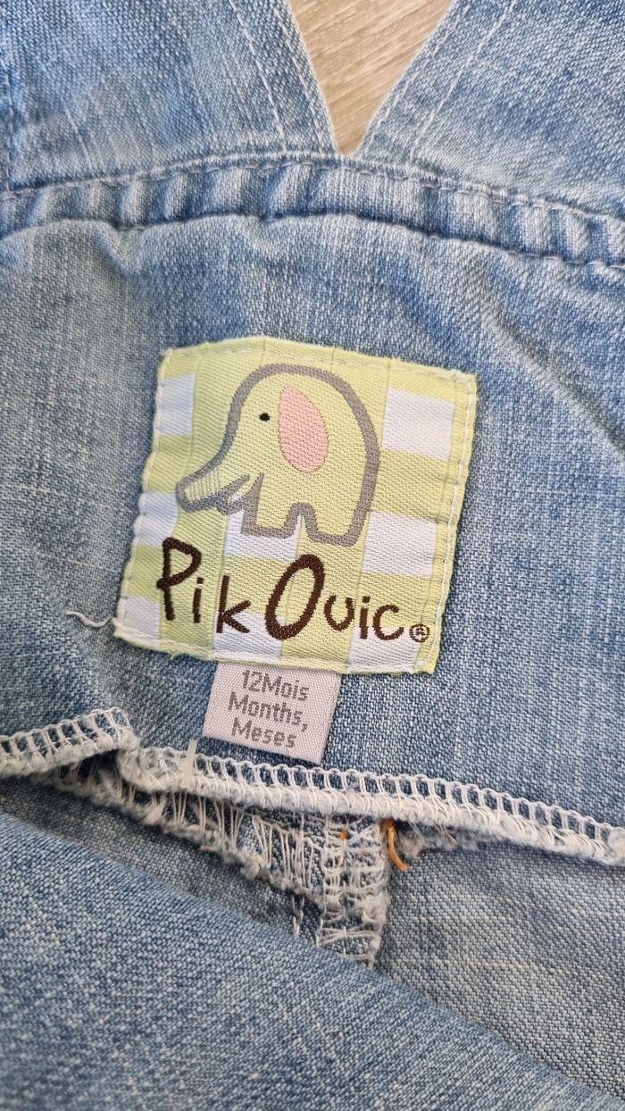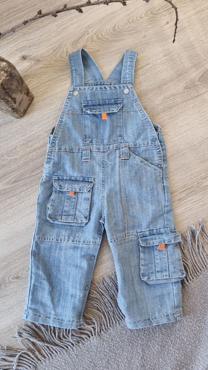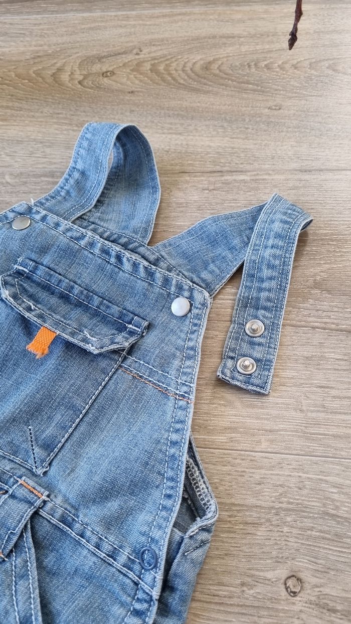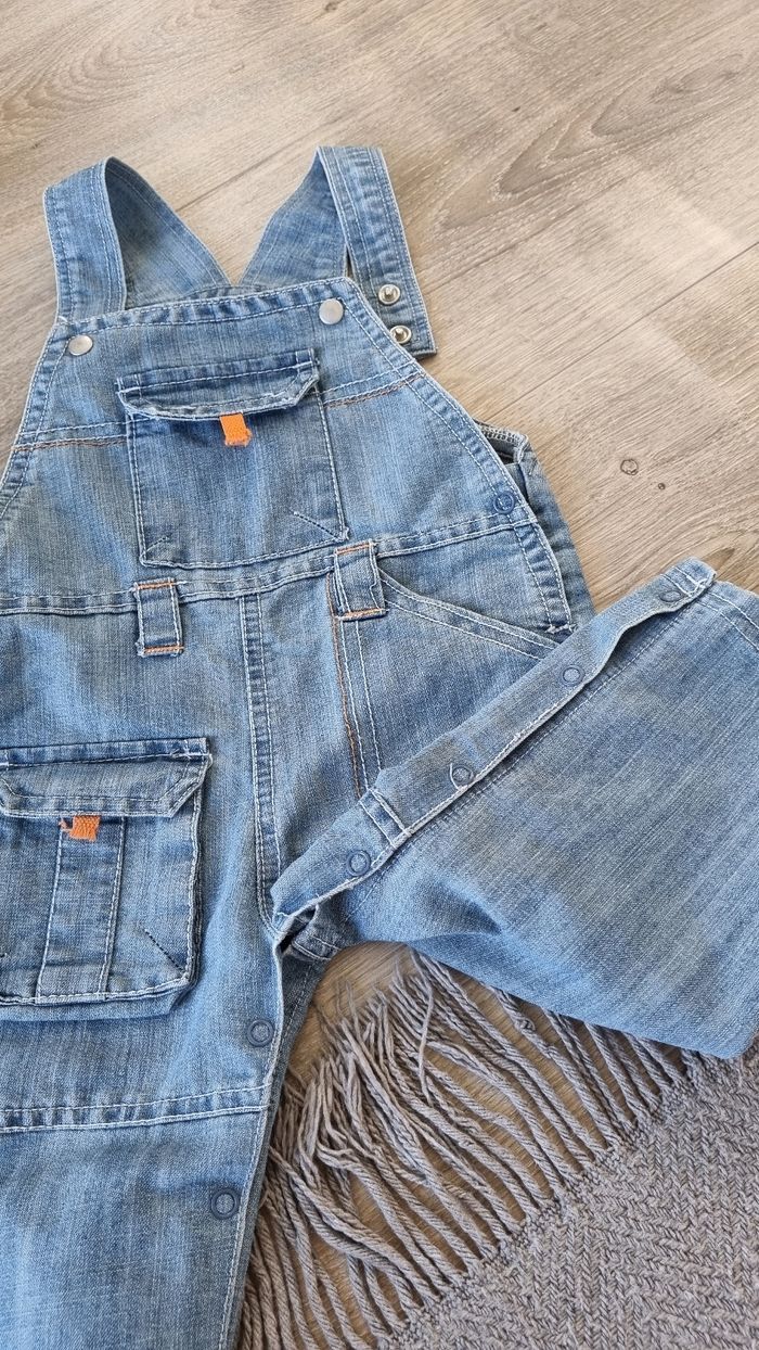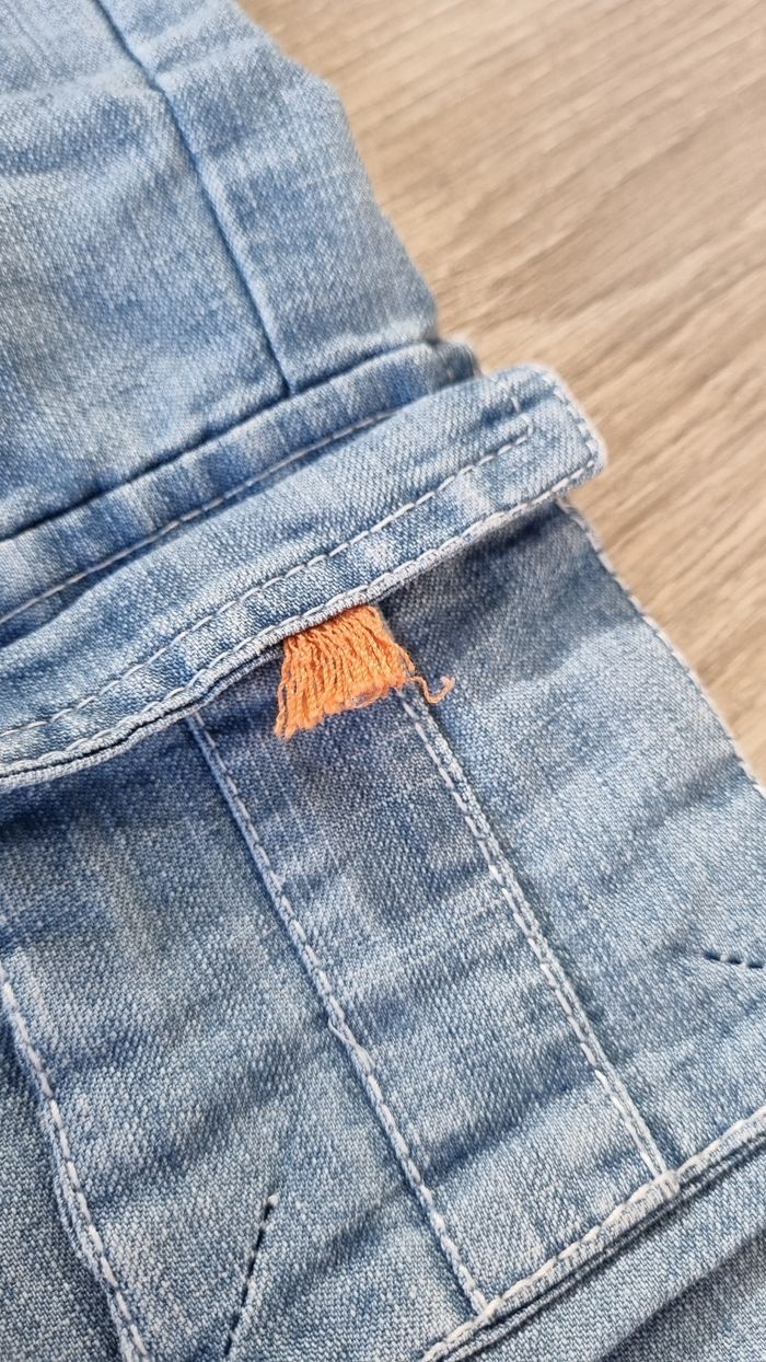 Salopette en jean souple, relativement fine. Ouverture pratique à l'entrejambe, par des boutons pressions. Deux hauteurs pour le réglage des bretelles. Seule imperfection: une languette orange d'une des poches, qui est "détricotée" par rapport aux autres (voir photo n°6)