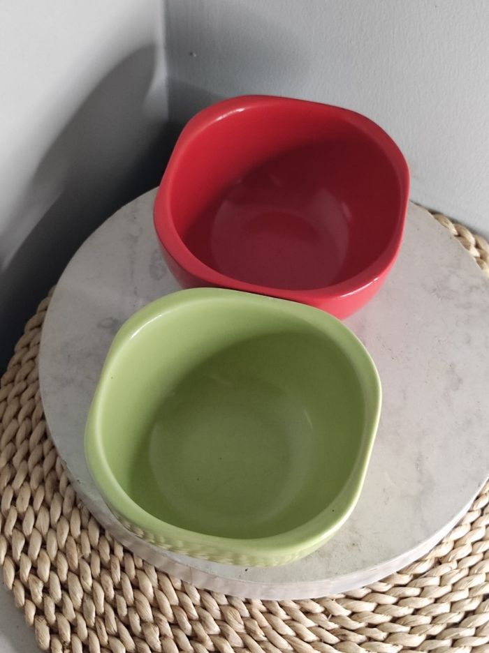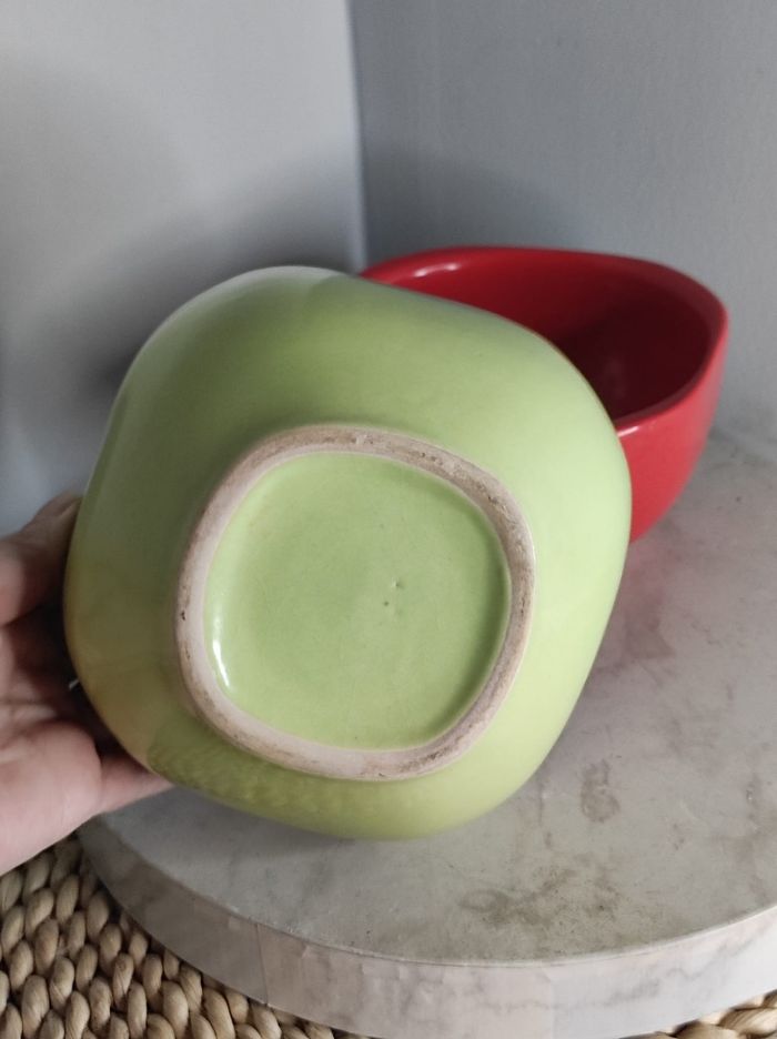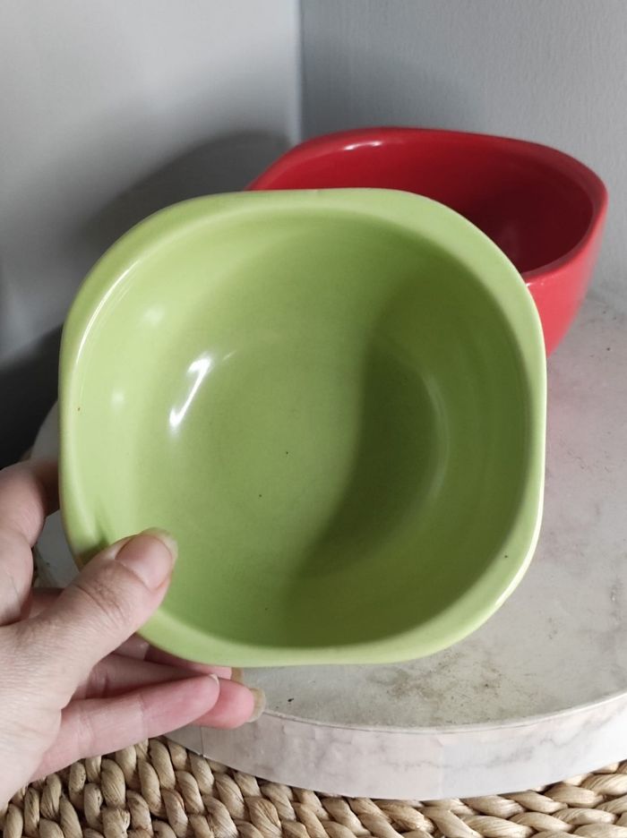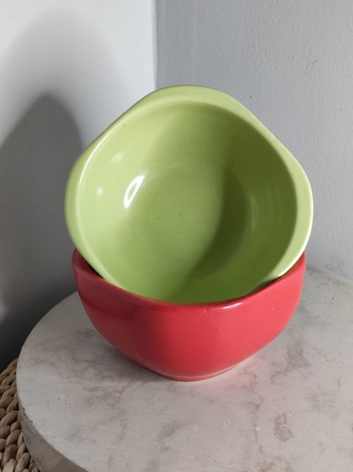Duo de grands bols épais en céramique de couleur vert anis et rouge avec une forme semi carré. Dimensions H 7 cm x D 13,5 En parfait état Ni fêle ou ebruchures