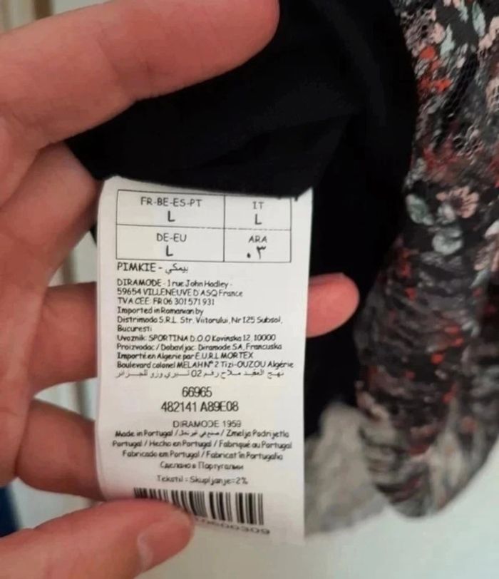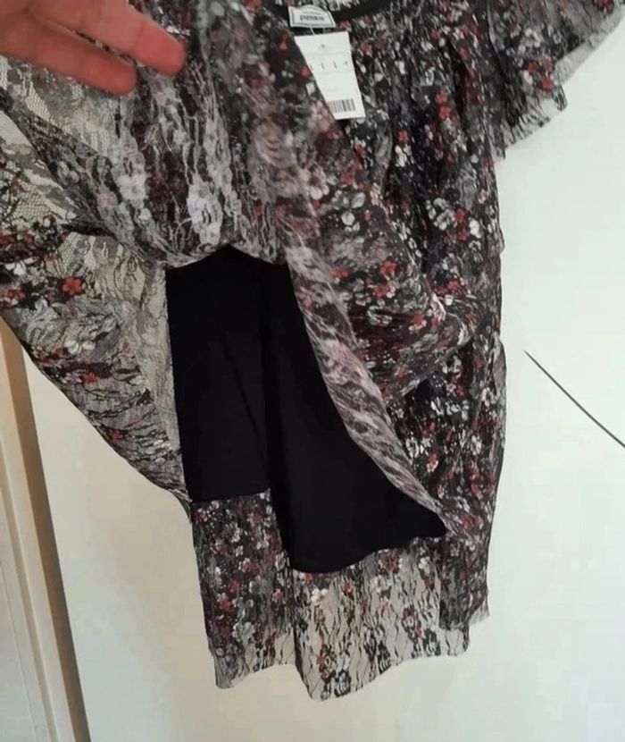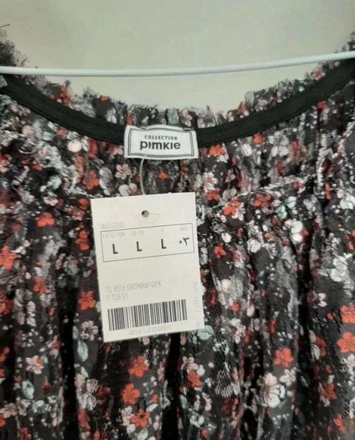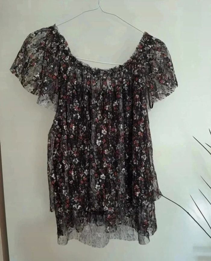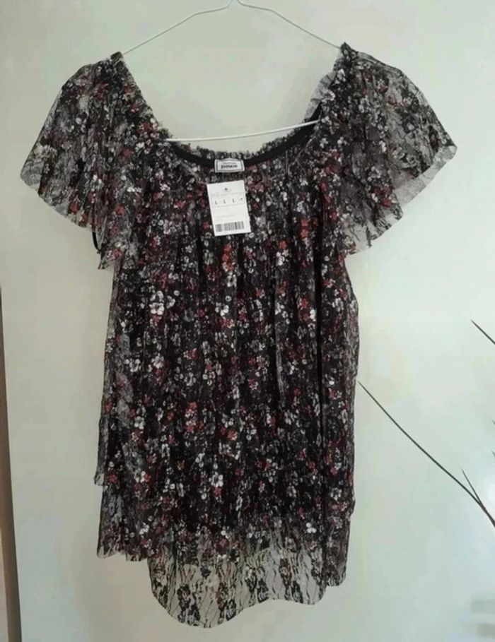 Chouette t-shirt avec col "élastique" et manches volantes. Deux couches avec effet un peu dentelles et motifs floraux. Pimkie taille L, neuf avec étiquette. Je le vends au prix de 10 euros. #TailleL40marine