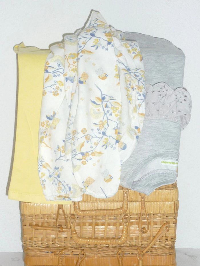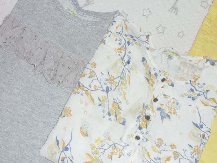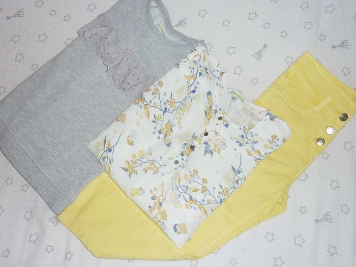🌿Pour voir mes annonces dans cette taille, tapez #karinelillefille8ans 🌿 Look en parfait état composé du pantalon jaune, coupe près du corps TAO associé à la blouse et au sweat Vert Baudet.