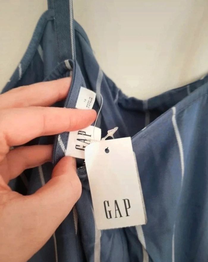 Combinaison GAP taille 12 (selon moi correspond à du 40/42 mais vérifiez la taille de cette marque). Neuve avec étiquette. Deux poches. Jambes larges. Tirette. Bleue lignée blanche. Je la vends au prix de 25 euros. #TailleL40marine #TailleXL42marine