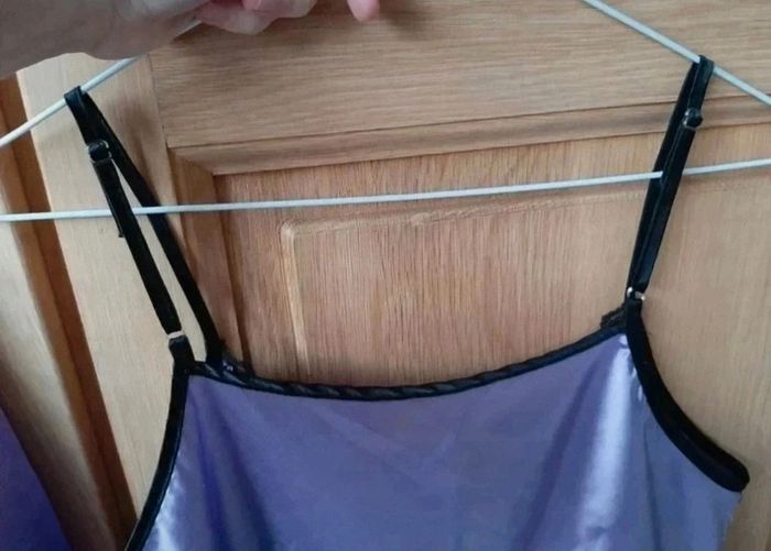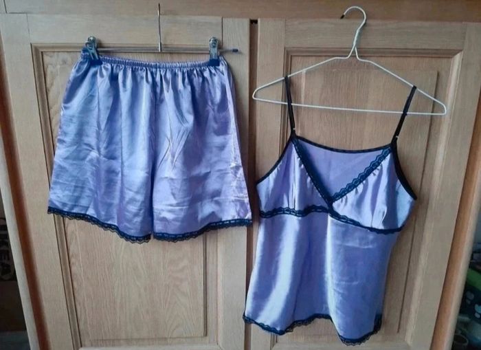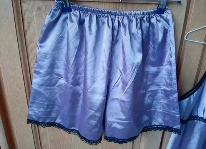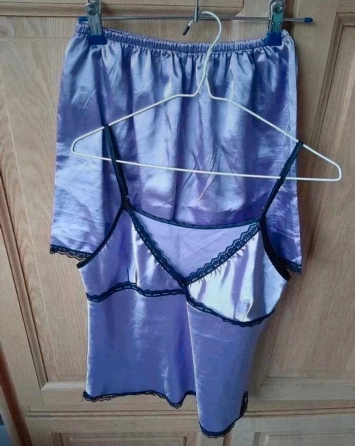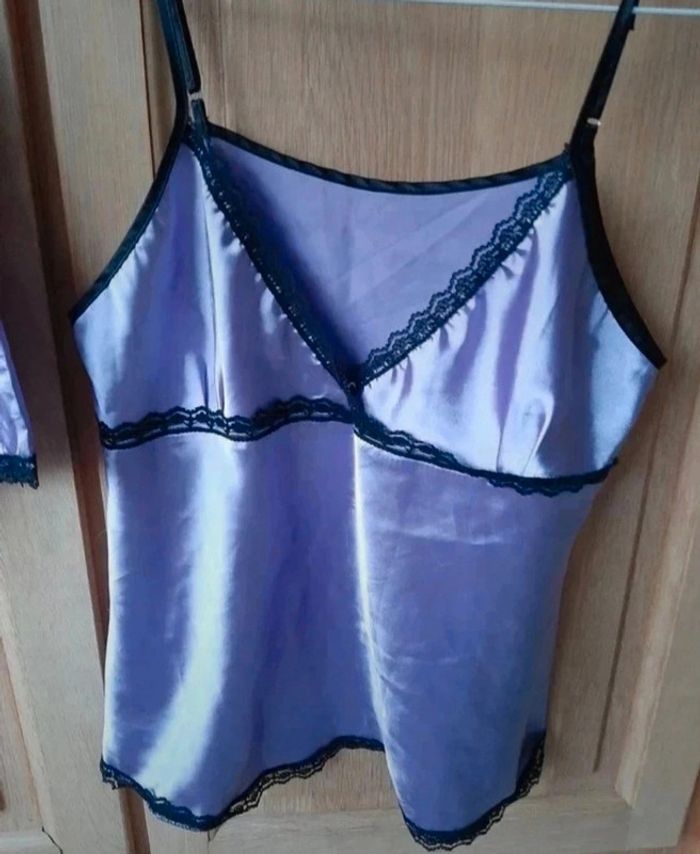Pyjama short et top bretelles réglables. Beau mauve et dentelles noires. Bretelles réglables. Indiqué taille L mais c'est plus M. Très bon état, jamais porté. Minis défauts sur la poitrine (avec ce genre de matière...). Je le vends au prix de 8 euros. #TailleM38marine