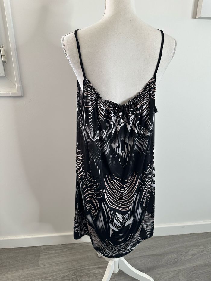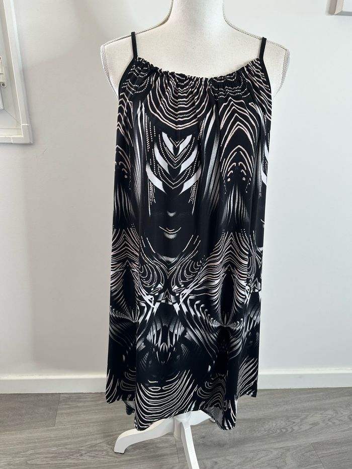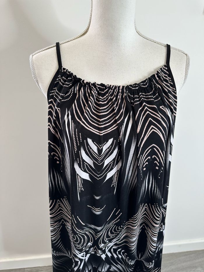 Robe - Excellent état - Taille 48 équivalent 4XL Dimensions en bas de l’annonce - Noire et blanche - Fines bretelles - Tissus bariolé - Pas d’étiquette de taille ni de matière Dimensions: - 62cm niveau aisselles - 98cm de long