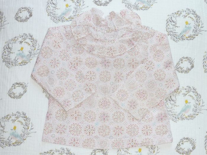 Blouse en état neuf, de marque JACADI, imprimé fleuri, dans les tons couleur nude et rose pastel, avec un col collerette. Splendide.